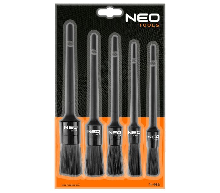 Zestaw pędzelków detailingowych 5 szt. 11-462 NEO TOOLS to niezbędne akcesorium do dokładnego czyszczenia trudno dostępnych miejsc w samochodzie. W skład zestawu wchodzi 5 pędzelków o różnych rozmiarach: 21 × 205 mm, 24 × 220 mm, 26 × 225 mm, 30 × 230 mm, 34 × 240 mm, co pozwala dobrać odpowiednie narzędzie do konkretnego zadania. Zarówno uchwyt, jak i włosie wykonane są z trwałego tworzywa PP, odpornego na działanie chemii.