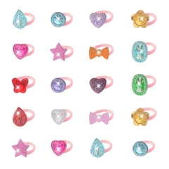W zestawie znajdują się różne wzory, takie jak serduszka, gwiazdki, korony, kwiatki, kokardki czy duże cyrkonie. Każdy pierścionek wykonano z lekkich, przyjemnych w dotyku materiałów, które pięknie odbijają światło, tworząc efekt kolorowych błyszczących kryształków. Produkt idealnie sprawdzi się podczas zabawy tematycznej, urodzin, przyjęć, jako nagrody w konkursach lub dodatek do prezentu.