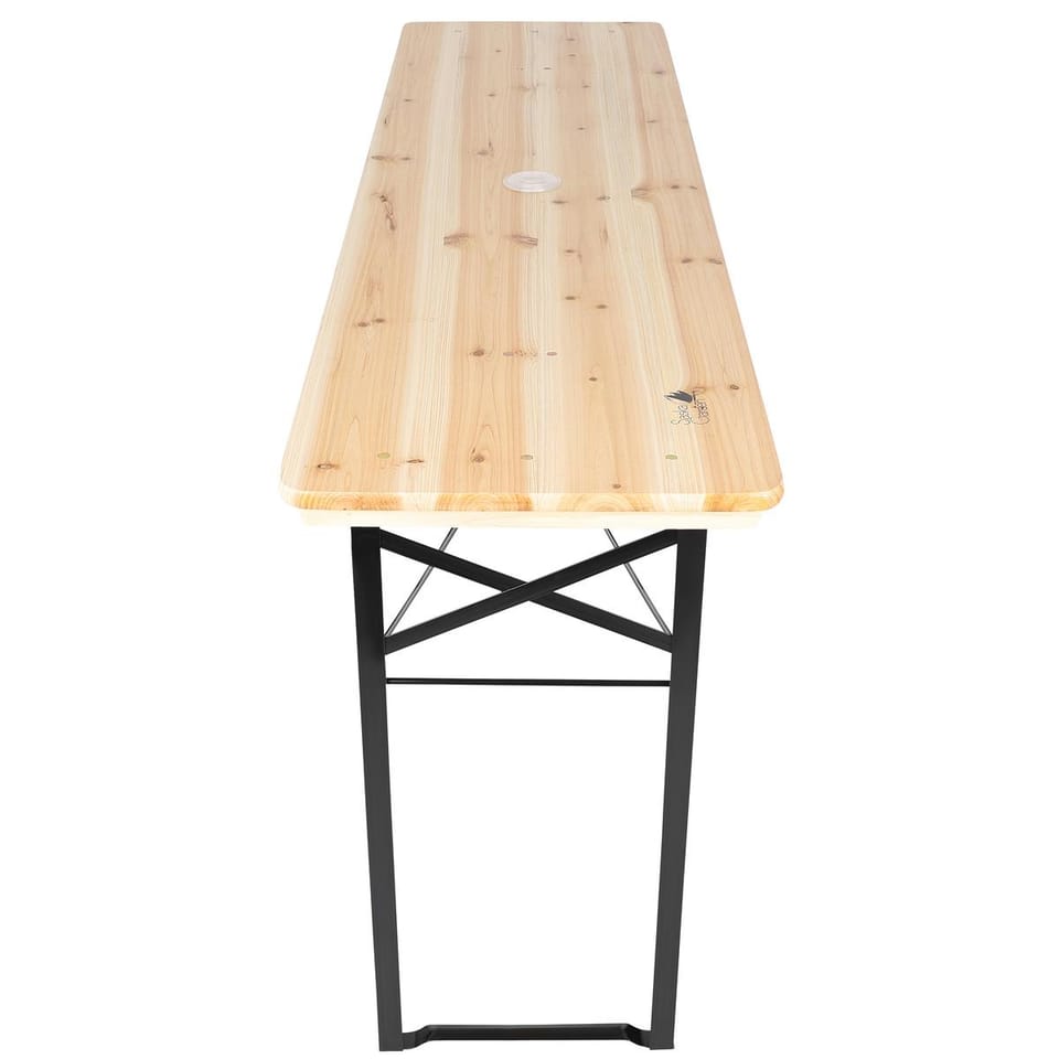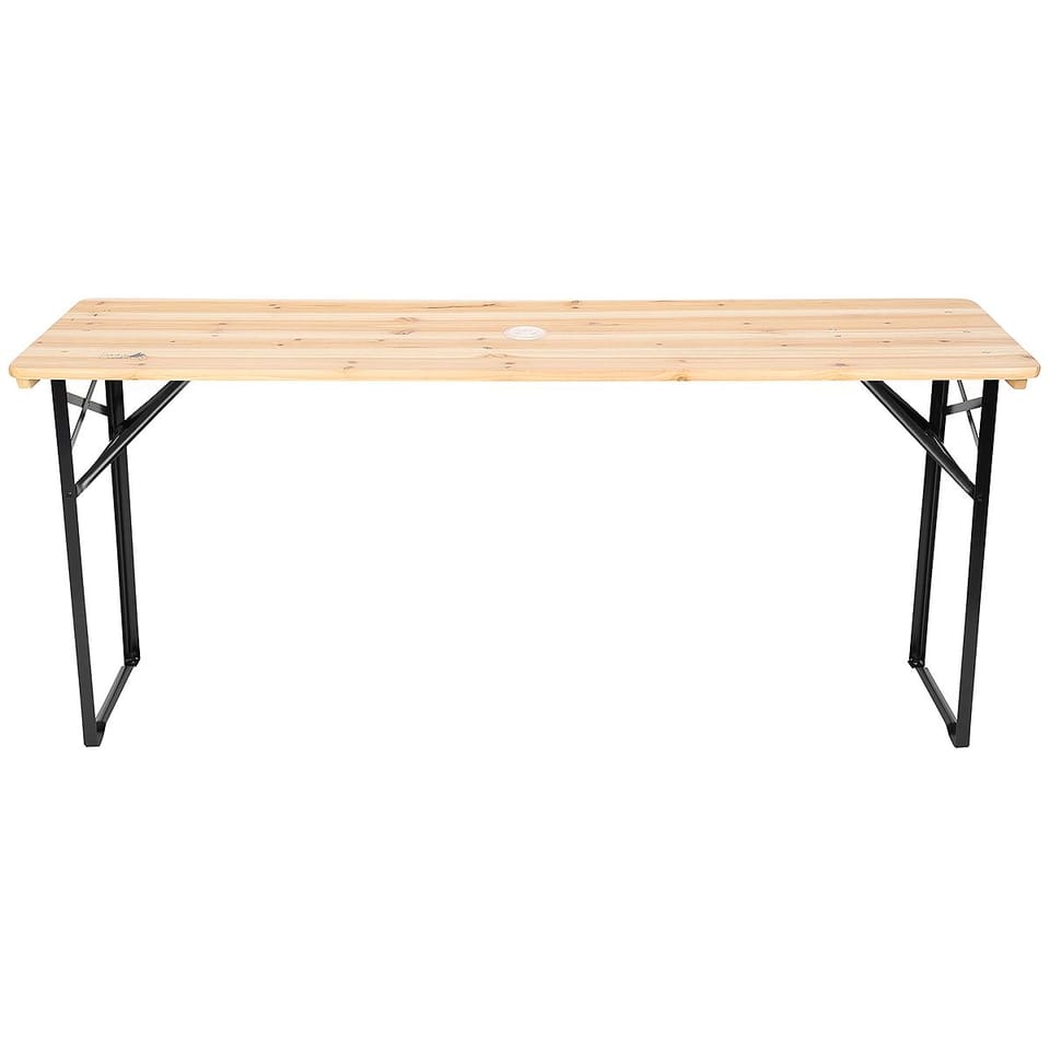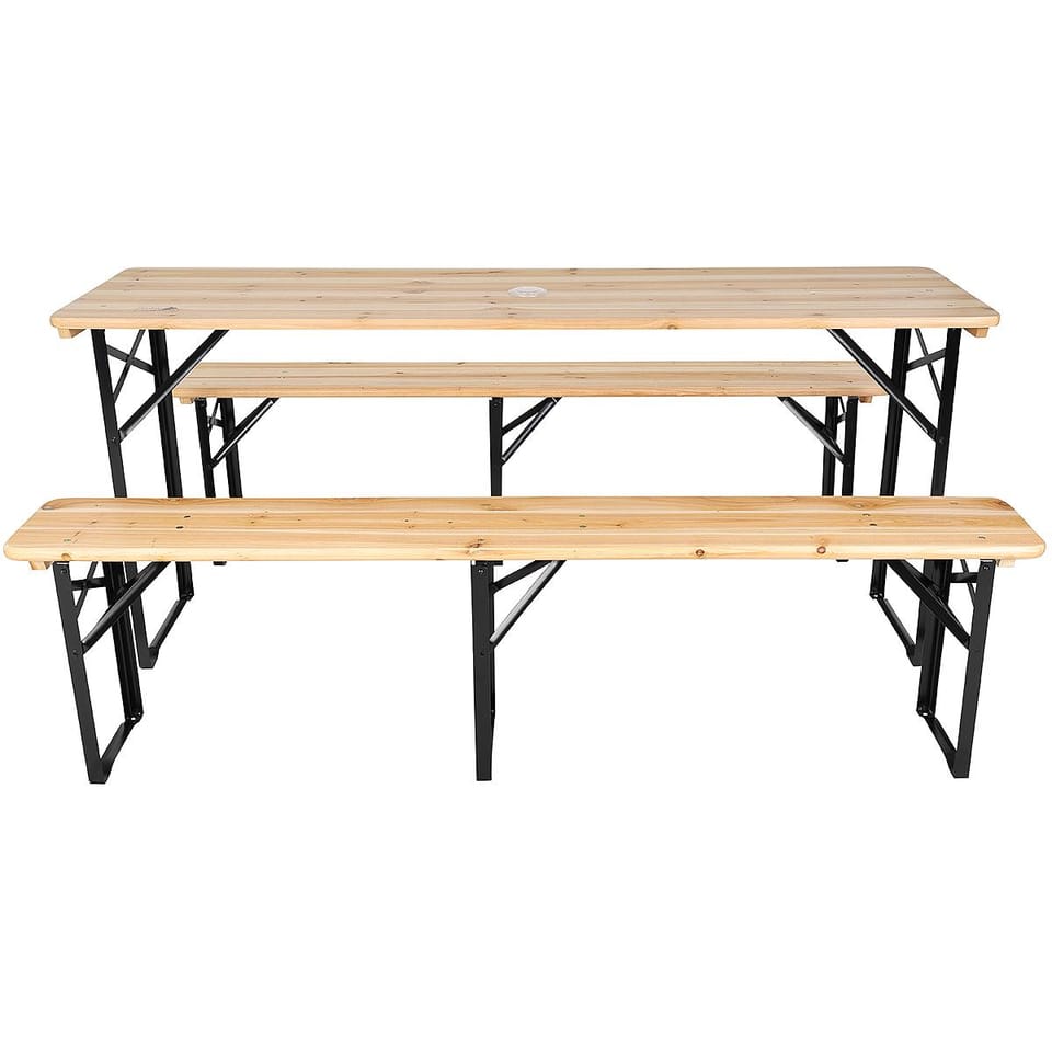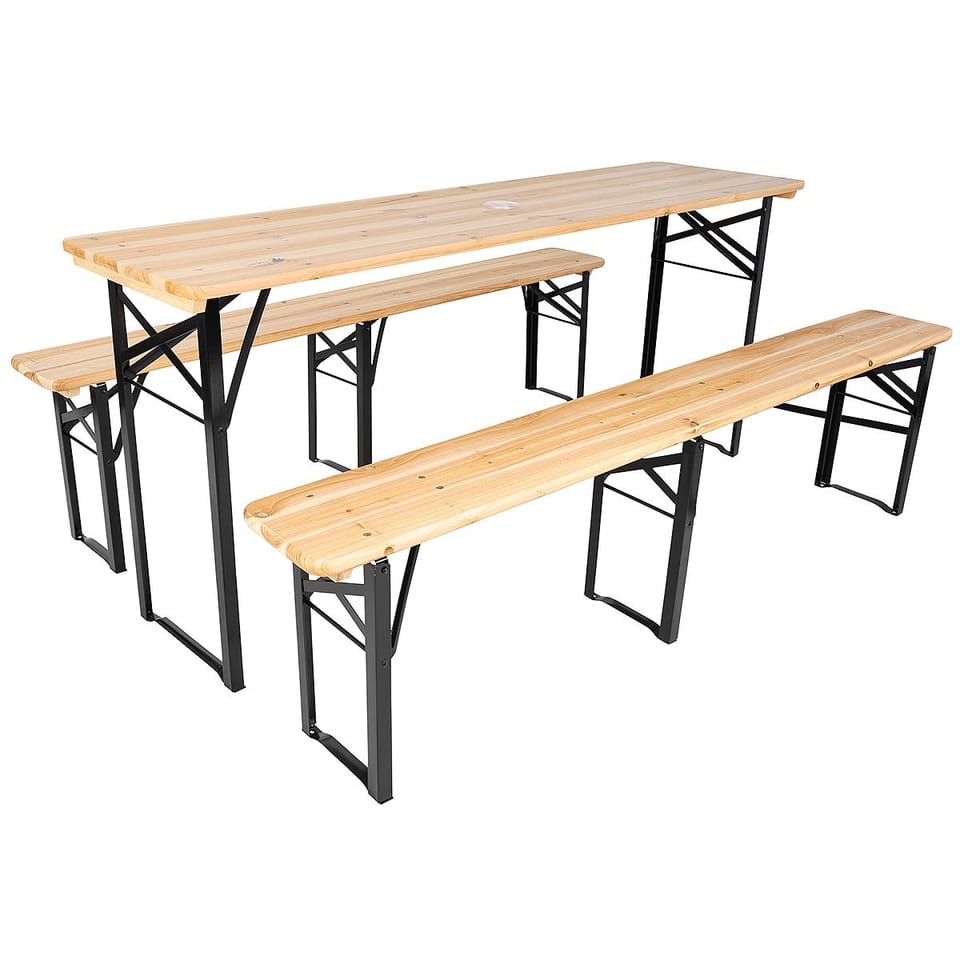 - optymalne wymiary zestawu pozwolą na wygodny wypoczynek i biesiadęmaksymalne obciążenie stołu to 100 kg, a każdej ławy aż 300 kgpo złożeniu nóżek zajmuje niewiele miejsca, dzięki temu jest łatwy w przechowywaniu i transporciesolidna, metalowa konstrukcja zapewnia stabilność i długą trwałośćdługie na 170cm i szerokie na ok.23 cm ławki pozwolą wygodnie się rozsiąść przy stolestół z grubym na 2 cm blatem i długością na 170 cm, pozwoli na wygodne spożycie posiłków i napoiotwór z zaślepką w stole, pozwoli zamontować parasol ogrodowy chroniący przed nadmiernym słońcemcały zestaw został wykonany w uniwersalnym i klasycznym stylu