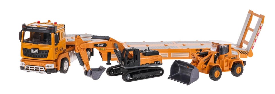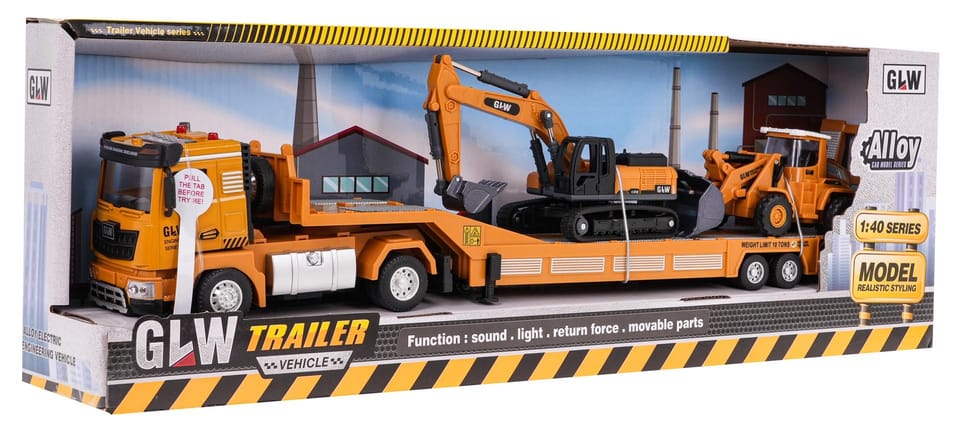 Interaktywny zestaw pojazdów budowlanych z lawetą dla dzieci od 3-go roku życia. Zestaw wykonany został z najlepszej jakości materiałów, metal łączony z plastikiem. Tir budowlany posiada efekty dźwiękowe i świetlne takie jak dźwięk odpalanego pojazdu, cofania, klaksonu, migające światła z przodu oraz na dachu ciężarówki. Wszystkie efekty uruchamiają się po naciśnięciu na pojazd. Karoseria pojazdu jest metalowa, a wszystkie pozostałe jej elementy są plastikowe. Koparka i spychacz posiadają metalowe łyżki, oraz ruchome elementy takie jak łyżka, ramię, gąsienice. Tir budowlany posiada opuszczaną kabinę do przodu oraz napęd pull-back i gumowe opony, zapewniające mu lepszą przyczepność do podłoża. Lawetę możemy odpiąć od ciężarówki. Tył lawety otwiera się, aby zapewnić lepszy rozładunek pojazdów budowlanych. Zabawka zasilana jest bateriami typu 3 x AG13 (w zestawie). Funkcje zestawu: - przeznaczony dla dzieci od 3-go roku życia, - skala odwzorowania z oryginałem 1:40, - wiele możliwości zabawy, - solidne wykonanie: metal łączony z plastikiem. Metalowa kabina tira, metalowe łyżki koparki i spychacza, - ruchome elementy: kabina tira odchylana w przód, otwierana tylna klapa lawety, ruchoma łyżka i ramię spychacza, ruchoma łyżka i ramię koparki, kabina w koparce obraca się o 360 stopni, - napęd pull-back, - gumowe opony, - efekty dźwiękowe: odgłosy odpalanego pojazdu, cofania, klaksonu, - efekty świetlne: świecące światła z przodu oraz migający kogut na dachu tira, - odpinana laweta.