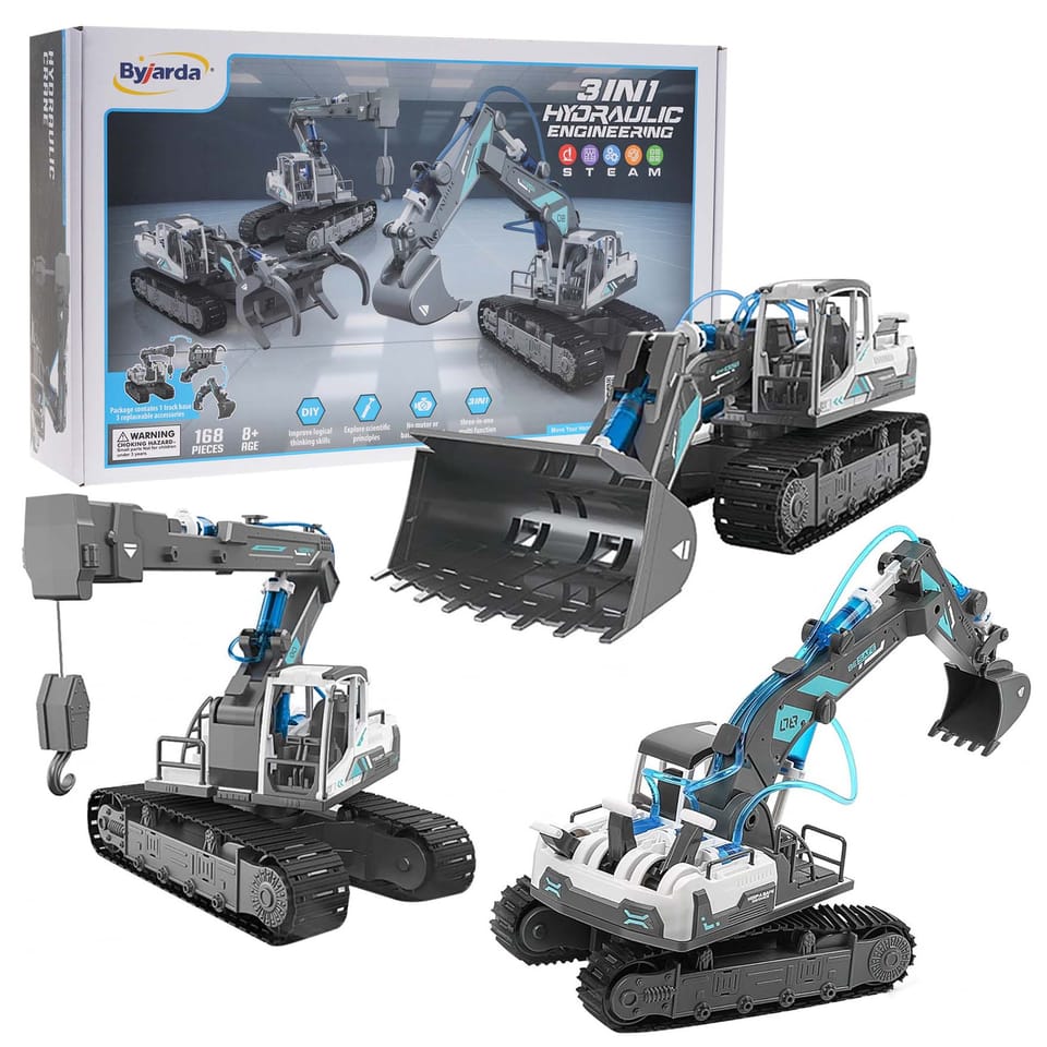 | Zestaw naukowy 3 w 1 pojazdy do składania dla dzieci od 8-go roku życia. Cały zestaw składa się z 168 elementów, z których można ułożyć 3 kombinacje pojazdów. Pojazdy nie wymagają użycia baterii, posiadają zasilanie hydrauliczne na wodę. Zasilanie hydrauliczne odpowiada za czynności takie jak chwytanie, unoszenie i opuszczanie. Zestaw zawiera szczegółową instrukcję montażu każdego modelu.Pojazdy możliwe do złożenia:- koparka,- ładowarka do drewna,- dźwig.Funkcje: Koparka- ruch drążka w zakresie 52 stopni,- ruch łyżki w zakresie 60 stopni,- ruch wysięgnika w zakresie 31 stopni,- obrotowa platforma w zakresie 360 stopni,- gumowe obrotowe płozy Ładowarka do drewna- ruch drążka w zakresie 37 stopni,- ruch łyżki w zakresie 30 stopni,- ruch wysięgnika w zakresie 44 stopnie,- obrót platformy w zakresie 360 stopni,- gumowe obrotowe płozy Dźwig- ruchomy podnośnik góra – dół,- ruch wysięgnika w zakresie 33 stopnie,- ruch drążka w zakresie 38 stopni,- obrót platformy w zakresie 360 stopni,- gumowe obrotowe płozy | |