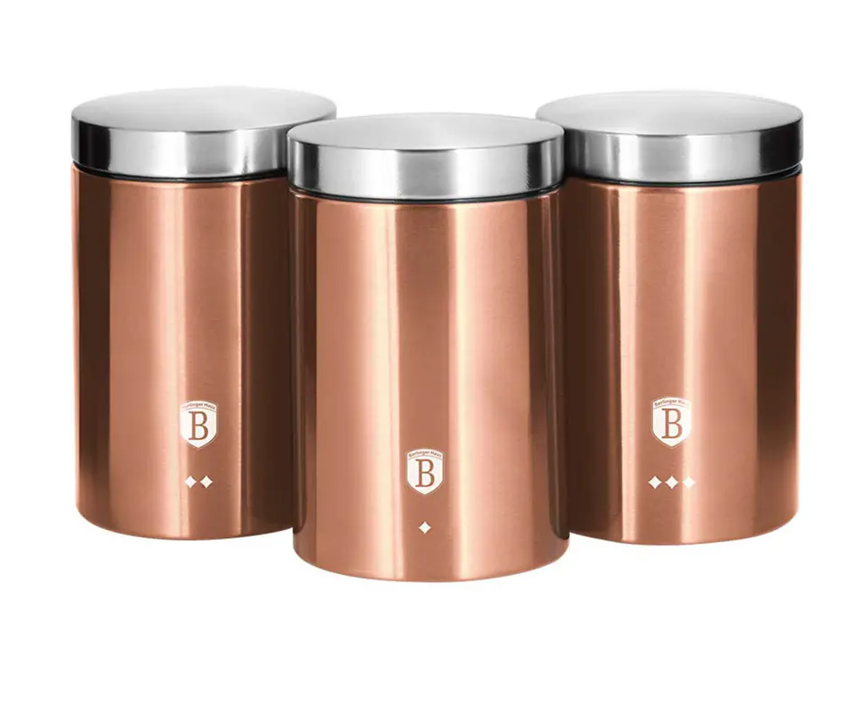 Zestaw 3 pojemników do przechowywania produktów sypkich takich jak kawa, herbata, cukier. Pojemniki z linii Rose Gold firmy Berlinger Haus.Wykonane ze stali lakierowanej na kolor metaliczny.