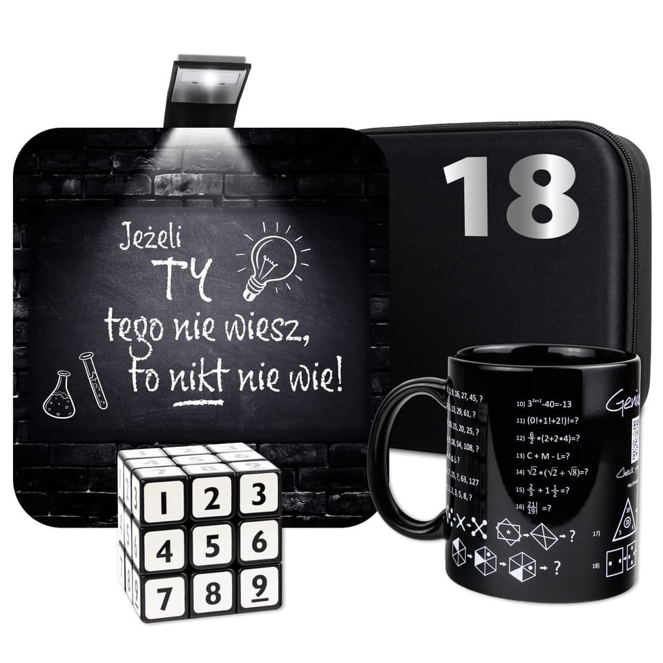 Prezent urodzinowy dla geniusza Ten wyjątkowy zestaw to idealny prezent urodzinowy dla kogoś, kto zawsze ma odpowiedź na każde pytanie i wyróżnia się ogromną wiedzą. Zestaw zawiera kubek z zagadkami logicznymi i matematycznymi, który idealnie sprawdzi się podczas porannej kawy, oraz kostkę logiczną sudoku, która zapewni chwile intelektualnej rozrywki. Całość zapakowana jest w eleganckie etui, dzięki czemu prezent nie tylko jest praktyczny, ale także niezwykle stylowy. To doskonały wybór na urodziny dla każdego miłośnika łamigłówek i wyzwań umysłowych. Prezent dla osoby, której wiedza nie zna granic Hasło na produkcie świetnie oddaje, jak bardzo cenisz wiedzę i wyjątkowe zdolności danej osoby. Ten zestaw to doskonały sposób na wyrażenie uznania dla kogoś wyjątkowego, ale równie dobrze sprawdzi się jako żartobliwy prezent dla znajomego. Jest to symbol podziwu dla niezwykłych umiejętności, a zarazem zabawny gest z nutą luzu. Podejmij intelektualne wyzwanie Kubek Geniusza to nie jest zwykły kubek, to wyzwanie dla umysłu. Zaprojektowany z myślą o osobach, które uwielbiają stawiać czoła intelektualnym wyzwaniom, kubek ten zawiera zestaw 34 zadań do rozwiązania, które na pewno dostarczą satysfakcji i radości każdemu geniuszowi. Jego unikalny nadruk sprawi, że będzie wyróżniać się na każdym biurku. A jego właściciel? Z pewnością zostanie doceniony za swój bystry umysł! Sprawdź swoje odpowiedzi Jeśli zastanawiasz się nad tym, czy znalazłeś odpowiedź na jedno z zadań, nie martw się! Rozwiązania dostępne są na dedykowanej stronie internetowej, dzięki czemu w każdej chwili możesz sprawdzić, czy jesteś na dobrej drodze. Łamigłówka na wielu płaszczyznach Kostka Sudoku to połączenie dwóch niezwykle popularnych łamigłówek.Na każdej ścianie znajdziesz cyfry od 1 do 9, a Twoim zadaniem jest ułożyć kostkę tak, aby na jednej ścianie cyfry się nie powtórzyły.Dzięki płynniej pracy obrotowego mechanizmu przyjemność z rozwiązywania łamigłówki jest jeszcze większa. Lampka do czytania, którą zabierzesz wszędzie Ile razy zdarzało się, że musiałeś przerwać lekturę ulubionej książki w najbardziej fascynującym momencie, żeby zgasić światło, które przeszkadzało próbującym właśnie usnąć współlokatorom? Z pewnością trudno było pogrążyć się we śnie zastanawiając się, co czeka bohaterów tej książki, a do rana przecież tak daleko…Na szczęście z tym gadżetem nie będziesz mieć już więcej takich problemów.