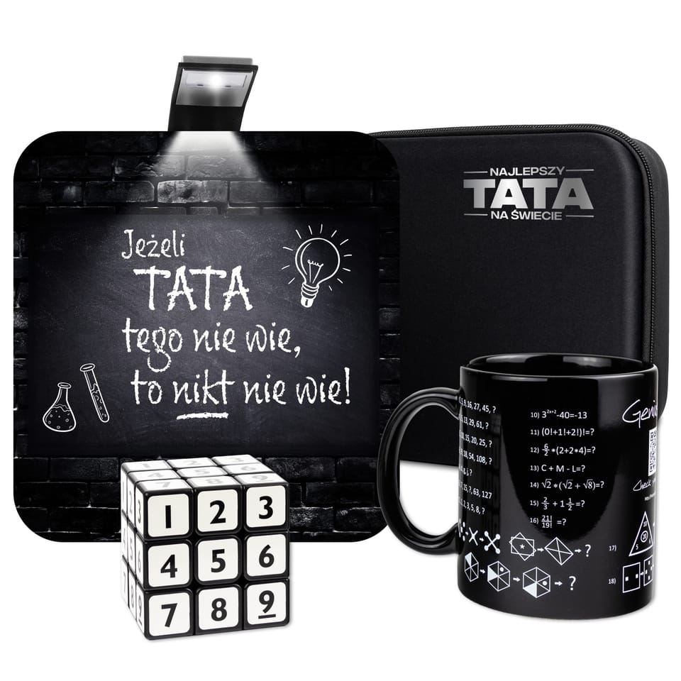 Prezent dla Taty, który zna odpowiedzi na wszystkie pytania Są ojcowie, którzy potrafią jednym uderzeniem młotka wbić dwa gwoździe, inni samodzielnie wniosą lodówkę na 8 piętro. Jeżeli jednak super mocą Twojego Taty jest jego niezwykły, bystry umysł i rozległa wiedza, ten zestaw prezentowy jest strzałem w dziesiątkę.To idealny wybór na prezent dla Taty, który wie wszystko i jest zawsze gotów podzielić się swoją wiedzą! Z tym zestawem pokażesz mu, jak bardzo doceniasz jego mądrość i wyjątkowość. Prezent dla bardzo mądrego Taty Hasło: "Jeżeli TATA tego nie wie, to nikt nie wie!", doskonale oddaje to, jak bardzo cenisz wiedzę i mądrość swojego Taty. To idealny sposób, by podziękować mu za wszystkie nauki i wsparcie, jakie otrzymałeś przez lata. Ten prezent na pewno wywoła uśmiech na jego twarzy i przypomni mu, że jest najlepszym tatą na świecie! Podejmij intelektualne wyzwanie Kubek Geniusza to nie jest zwykły kubek, to wyzwanie dla umysłu. Zaprojektowany z myślą o osobach, które uwielbiają stawiać czoła intelektualnym wyzwaniom, kubek ten zawiera zestaw 34 zadań do rozwiązania, które na pewno dostarczą satysfakcji i radości każdemu geniuszowi. Jego unikalny nadruk sprawi, że będzie wyróżniać się na każdym biurku. A jego właściciel? Z pewnością zostanie doceniony za swój bystry umysł! Sprawdź swoje odpowiedzi Jeśli zastanawiasz się nad tym, czy znalazłeś odpowiedź na jedno z zadań, nie martw się! Rozwiązania dostępne są na dedykowanej stronie internetowej, dzięki czemu w każdej chwili możesz sprawdzić, czy jesteś na dobrej drodze. Łamigłówka na wielu płaszczyznach Kostka Sudoku to połączenie dwóch niezwykle popularnych łamigłówek.Na każdej ścianie znajdziesz cyfry od 1 do 9, a Twoim zadaniem jest ułożyć kostkę tak, aby na jednej ścianie cyfry się nie powtórzyły.Dzięki płynniej pracy obrotowego mechanizmu przyjemność z rozwiązywania łamigłówki jest jeszcze większa. Lampka do czytania, którą zabierzesz wszędzie Ile razy zdarzało się, że musiałeś przerwać lekturę ulubionej książki w najbardziej fascynującym momencie, żeby zgasić światło, które przeszkadzało próbującym właśnie usnąć współlokatorom? Z pewnością trudno było pogrążyć się we śnie zastanawiając się, co czeka bohaterów tej książki, a do rana przecież tak daleko…Na szczęście z tym gadżetem nie będziesz mieć już więcej takich problemów.