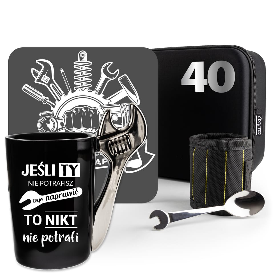- Skład zestawu: kubek, opaska, łyżeczka, etui, wkładka. Gotowy do wręczenia na prezent bez konieczności dodatkowego pakowania. Napis na wkładce: Złota rączka, wszystko naprawi. Produkt w polskiej wersji językowej. Kubek:Nadruk jednostronny. Napis na produkcie: Jeśli ty nie potrafisz tego naprawić, to nikt nie potrafi. Materiał: ceramika. Wymiary: 14,5 cm (wysokość), 400 ml (pojemność). Nadaje się do kontaktu z żywnością. Produkt bezpieczny