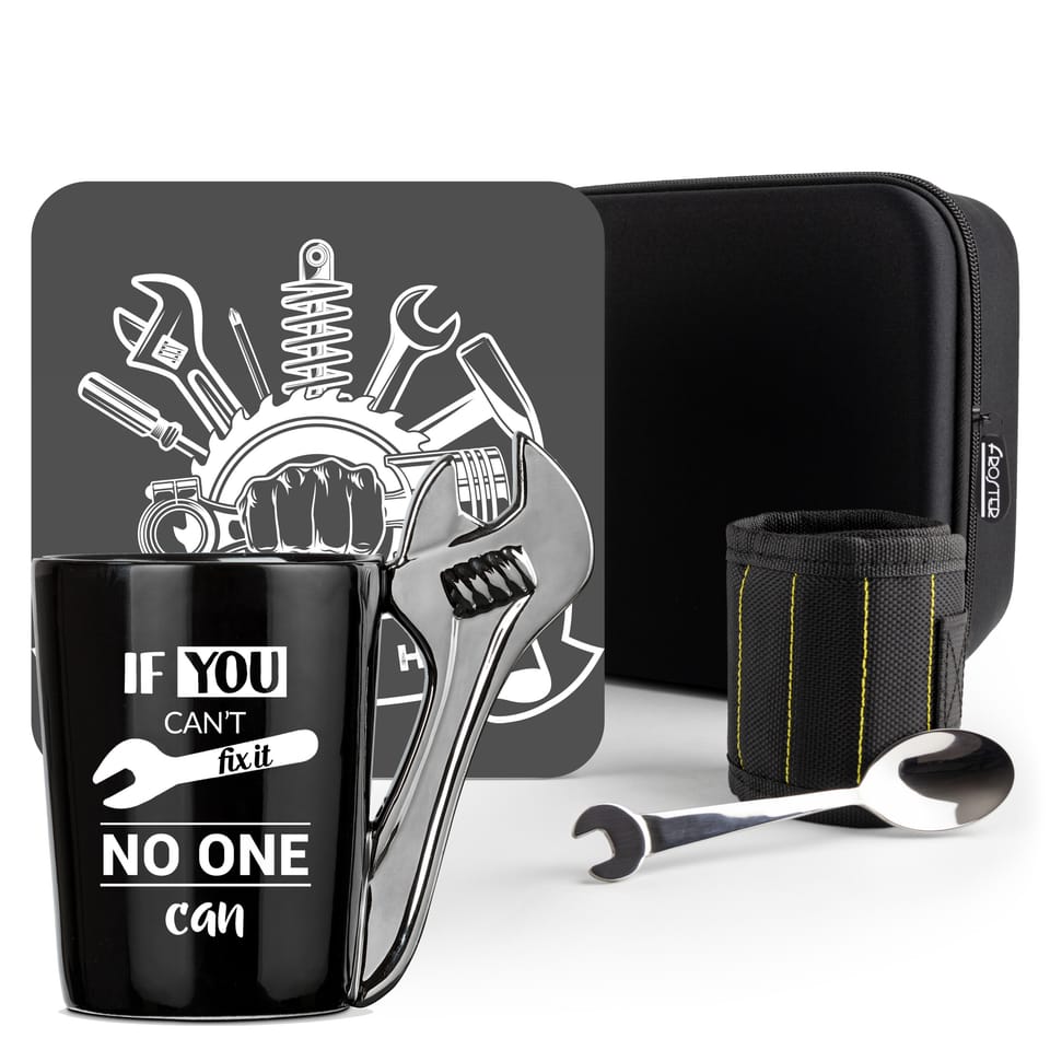 - Skład zestawu: kubek, opaska, łyżeczka, etui, wkładka. Gotowy do wręczenia na prezent bez konieczności dodatkowego pakowania. Napis na wkładce: Handyman Hero. Produkt w angielskiej wersji językowej. Kubek:Nadruk jednostronny. Napis na produkcie: If you can't fix it, no one can. Materiał: ceramika. Wymiary: 14,5 cm (wysokość), 350 ml (pojemność). Nadaje się do kontaktu z żywnością. Produkt bezpieczny