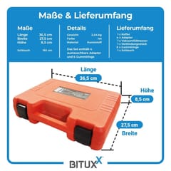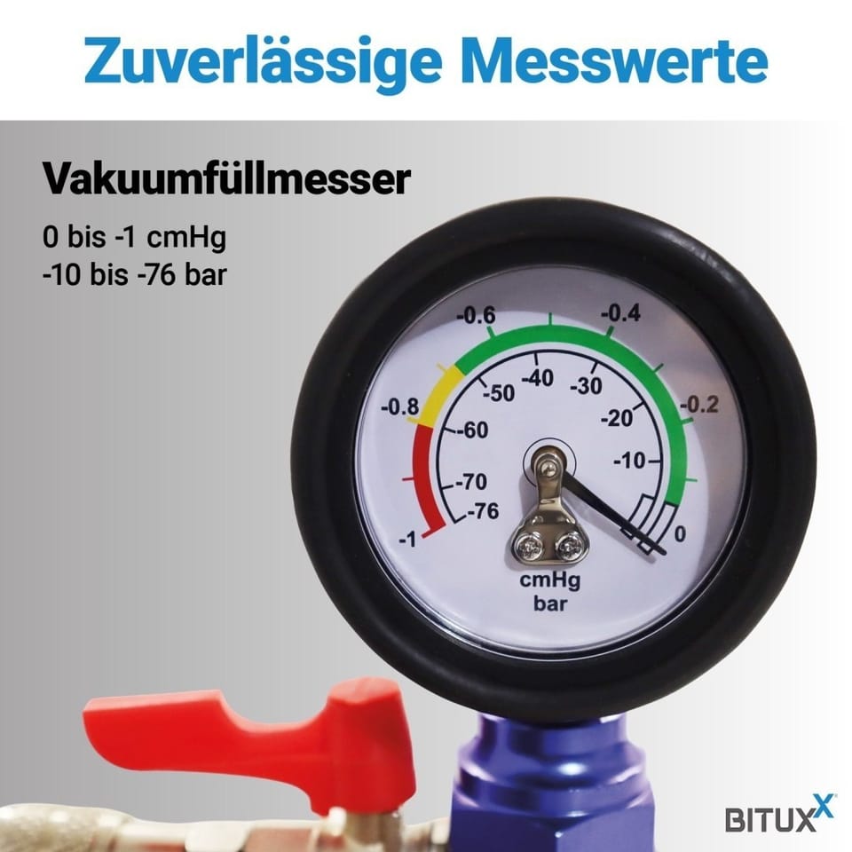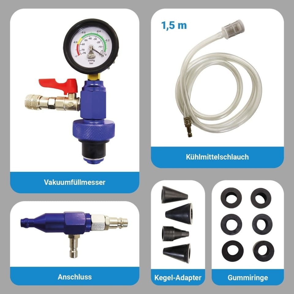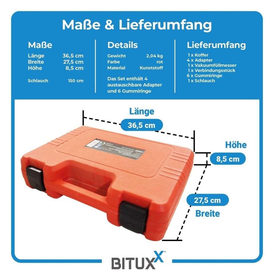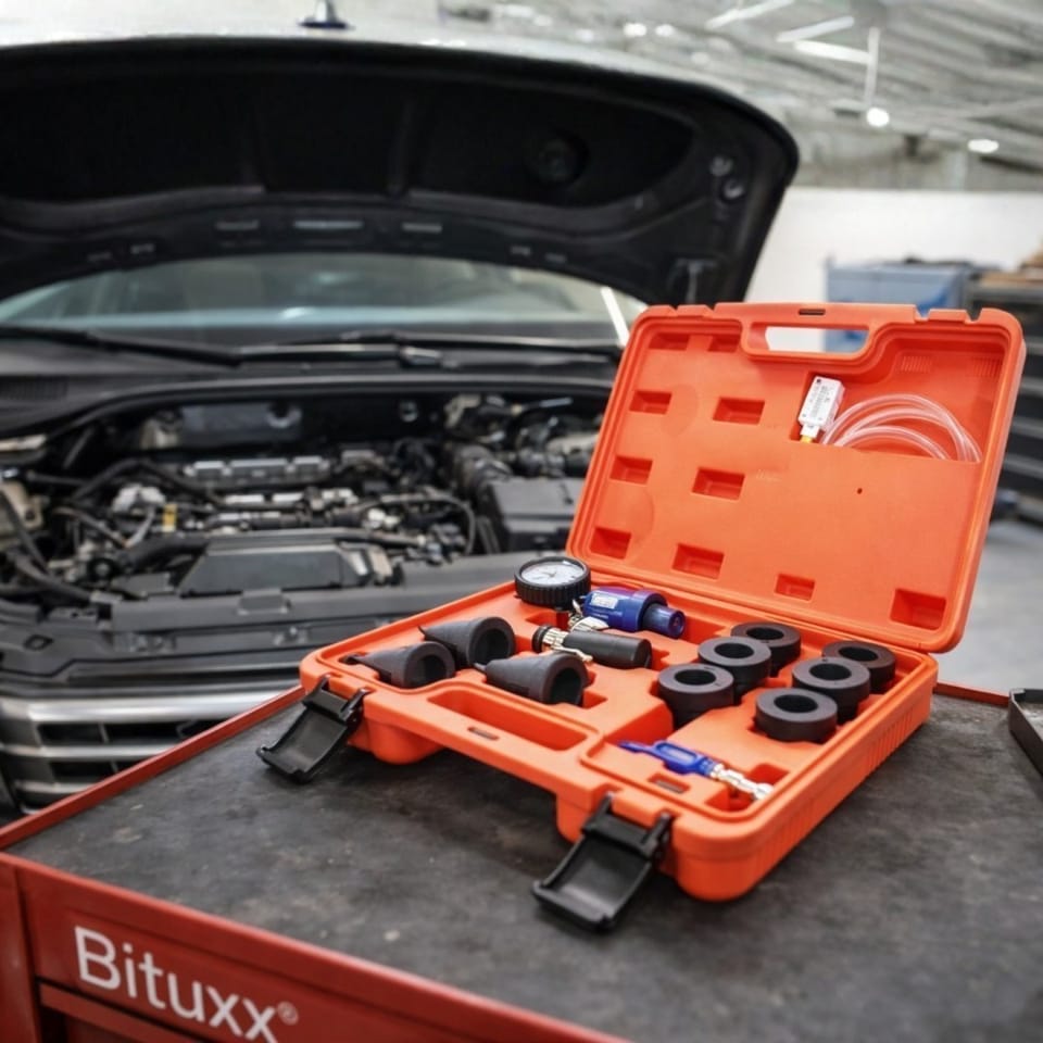 Profesjonalne urządzenie do odpowietrzania i napełniania układów chłodzenia metodą próżniową, przeznaczone do samochodów osobowych i dostawczych. Zestaw BITUXX umożliwia szybkie usunięcie powietrza z układu oraz równomierne napełnienie go płynem chłodniczym, bez ryzyka powstawania pęcherzy powietrza.