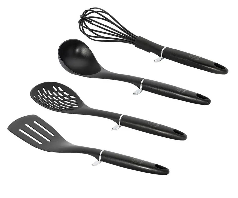 4 elementowy zestaw nylonowych przyborów kuchennych firmy BERLINGER HAUS z linii Black Silver. Przybory polecane szczególnie do naczyń z powłokami ceramicznymi i teflonowymi. Materiał z którego są wykonane nie rysuje powierzchni naczyń. Jest odporny na wysoką temperaturę do 210 stopni C. Posiada szczególne właściwości antybakteryjne.