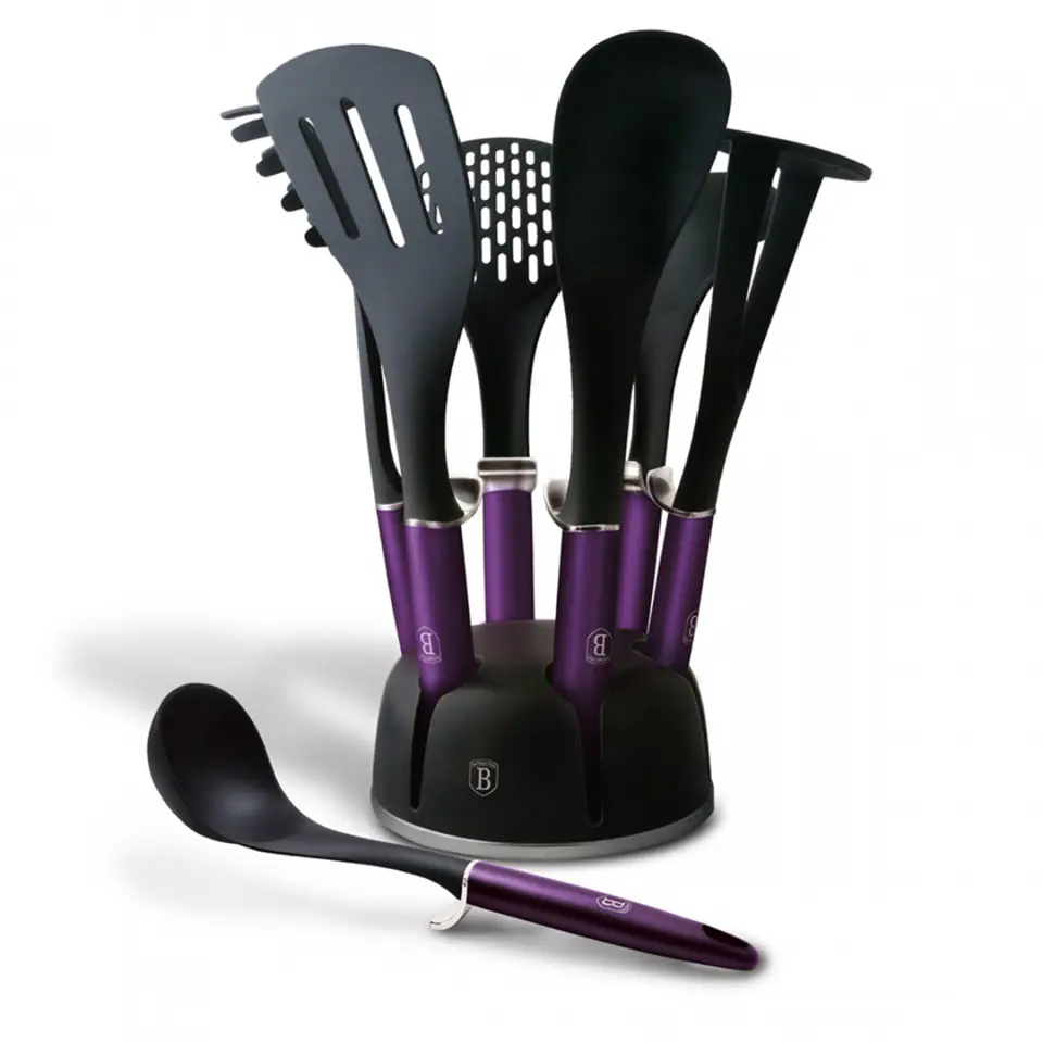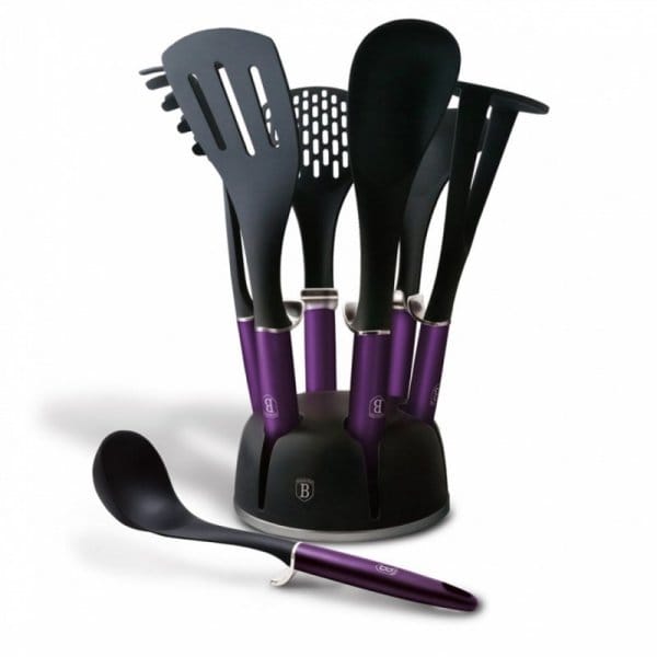 7 elementowy zestaw nylonowych przyborów kuchennych firmy BERLINGER HAUS z linii PURPLE ECLIPSE COLLECTION. Przybory polecane szczególnie do naczyń z powłokami ceramicznymi i teflonowymi. Materiał z którego są wykonane nie rysuje powierzchni naczyń. Jest odporny na wysoką temperaturę do 210 stopni C. Posiada szczególne właściwości antybakteryjne.