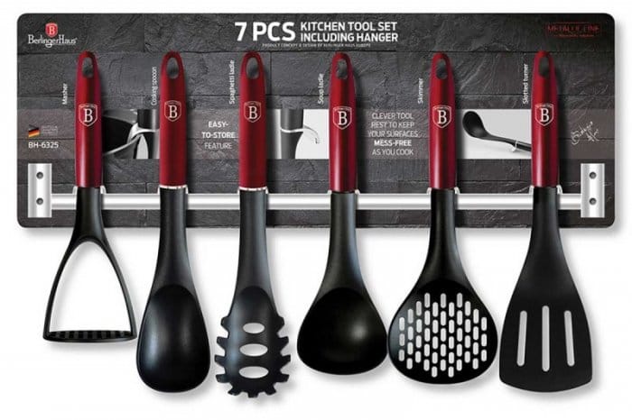 7 elementowy zestaw nylonowych przyborów kuchennych firmy BERLINGER HAUS z linii Burgundy Metallic Collection z praktycznym wieszakiem ściennym. Przybory polecane szczególnie do naczyń z powłokami ceramicznymi i teflonowymi. Materiał z którego są wykonane nie rysuje powierzchni naczyń. Jest odporny na wysoką temperaturę do 210 stopni C. Posiada szczególne właściwości antybakteryjne.