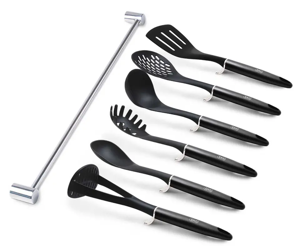 7 elementowy zestaw nylonowych przyborów kuchennych firmy BERLINGER HAUS z linii Carbon Pro Collection z praktycznym wieszakiem ściennym. Przybory polecane szczególnie do naczyń z powłokami ceramicznymi i teflonowymi. Materiał z którego są wykonane nie rysuje powierzchni naczyń. Jest odporny na wysoką temperaturę do 210 stopni C. Posiada szczególne właściwości antybakteryjne.