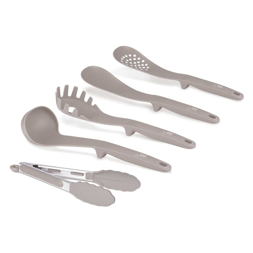 5 elementowy zestaw nylonowych przyborów kuchennych firmy BERLINGER HAUS z linii Taupe Collection. Przybory polecane szczególnie do naczyń z powłokami ceramicznymi i teflonowymi. Materiał z którego są wykonane nie rysuje powierzchni naczyń. Jest odporny na wysoką temperaturę do 210 stopni C. Posiada szczególne właściwości antybakteryjne.