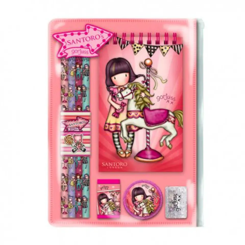 Zestaw Przyborów Szkolnych - Gorjuss - Carousel Fantastyczna seria Carousel ozdobiona jest dziewczynką Gorjuss z uroczym konikiem utrzymana w słodkich różowych kolorach. Na odwrocie fajerwerki, kolorowe girlandy, cukrowa wata - wszystko co znajdziemy w wesołym lunaparku. Zestaw przyborów szkolnych zapakowanych w przezroczysty piórnik zapinany na specjalny suwak. Wewnątrz znajduje się kołonotes z gładkimi kartkami, zawierajacy160 stron ozdobionych dekoracyjnym nadrukiem, 4 ołówki HB, temperówka, gumka oraz brokatowa taśma klejąca. Wymiary zestawu: 14,5 cm x 20,5 cm x 2 cm. Zabawna kolekcja Fairground pełna plecaków, akcesoriów i artykułów papierniczych, która nawiązuje do tajemniczych przygód przeżytych w Wesołym Miasteczku pełna fajerwerków, karuzel, beczek śmiechu, huśtawek i zdobywanych nagród. Zabawne pompony, wzory pełne smakołyków czy metalowe zawieszki przeniosą nas do barwnego świata Santoro, pełnego niespodzianek jakie nas czekają w lunaparku. To kolekcja, którą będziemy cenić przez wiele lat. Podążaj za dziewczynami, bohaterkami 4 serii: Up & Away, Fireworks, Carusel i First Prize i odkrywaj ekscytującą kolekcję cudownych smakołyków! 1038GJ09