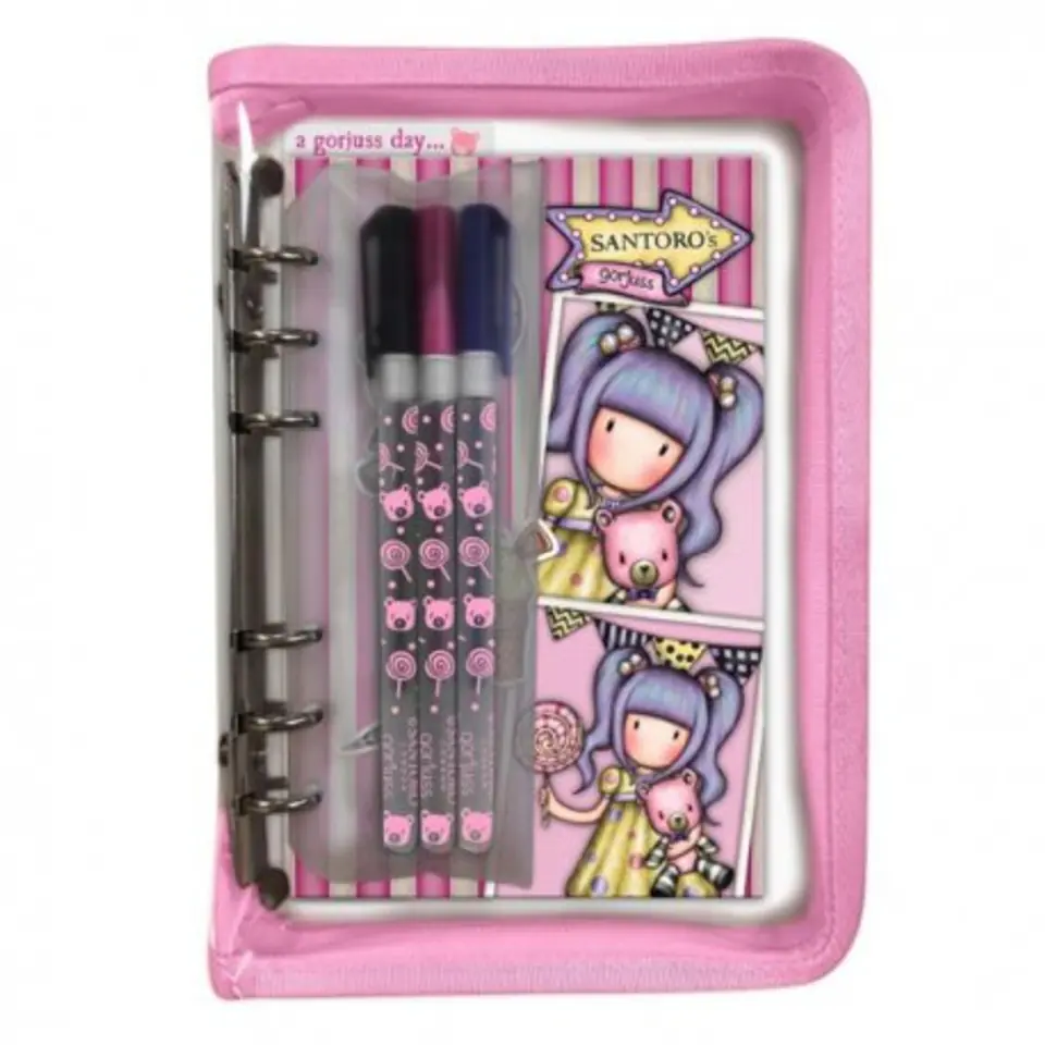 Zestaw Przyborów Szkolnych, Organizer - Gorjuss - First Prize Fantastyczna seria First Prize ozdobiona jest grafiką dziewczynki Gorjuss ze słodkim misiem, na tle w kolorze liliowym, wzbogacona akcesoriami z lunaparku: balonami, popcornem, lizakami, cukrową watą. Zestaw przyborów szkolnych zapakowanych w przezroczysty piórnik zapinany na specjalny suwak. Wewnątrz znajduje się kołonotes z 80 kartkami ozdobionymi dekoracyjnym nadrukiem. Na każdej stronie znajduje się miejsce na datę, godzinę oraz notatki dzięki czemu może pełnić funkcję organizera czy dziennika. Ponadto: 3 długopisy - granatowy, różowy i czarny, umieszczone w kieszonce na suwak. Dodatkowo - linijka mogąca pełnić funkcję zakładki. Wymiary: 15 cm x 21,5 cm x 2,5 cm. Zabawna kolekcja Fairground pełna plecaków, akcesoriów i artykułów papierniczych, która nawiązuje do tajemniczych przygód przeżytych w Wesołym Miasteczku. Nie brak tu fajerwerków, karuzel, beczek śmiechu, huśtawek i zdobywanych nagród. Zabawne pompony, wzory pełne smakołyków czy metalowe zawieszki przeniosą nas do barwnego świata Santoro. To kolekcja, którą będziemy cenić przez wiele lat. Podążaj za dziewczynami, bohaterkami 4 serii: Up & Away, Fireworks, Carusel i First Prize i odkrywaj ekscytującą kolekcję pełną cudownych smakołyków! 1137GJ02