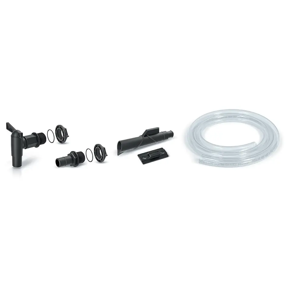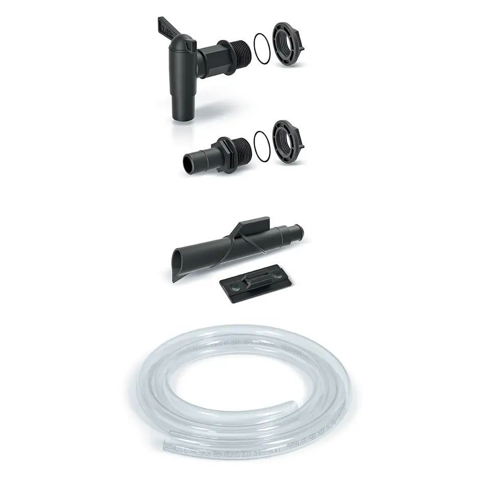 Zestaw składa się z:- kranika z gwintem 3/4" umożliwiającym wkręcenie kranu w gotowy otwór w deszczówce dodatkowo posiada nakrętkę, do zbiorników bez otworu z gwintemprzyłącza do węża ogrodowego z gwintem 3/4" umożliwiającym wkręcenie kranu w przygotowany otwór wraz z dodatkową nakrętką, do zbiorników bez otworu z gwintemprzeźroczystego, gumowego węża o średnicy wewnętrznej 1,2 cm i długość 1,4 mwylewki (wąskiego lejka)wieszaka do zamontowania na brzegu zbiornika na deszczówkę lub na ścianie