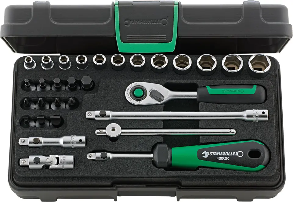 Zestaw QR kluczy nas. 1/4"; 30-częściowy 12 nas.6-kątnych 4-14mm+6 akcesoriów) w walizce ABS STAHLWILL