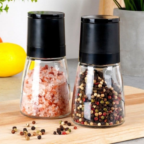 Zestaw dwóch ręcznych młynków do pieprzu i soli. Posiadają regulacje grubości mielenia za pomocą pokrętła. Wyposażone w pokrywkę oraz żarna ceramiczne.
