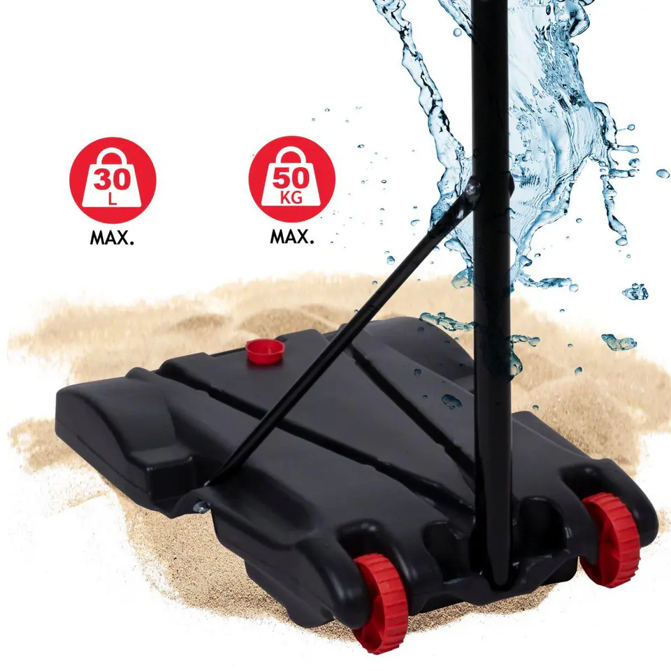 Aby grać w koszykówkę bezpiecznie i do woli, zestaw wyposażono w solidną podstawę. Należy ją tylko wypełnić maksymalnie 30 litrami wody lub 50 kilogramami piasku, aby zapobiec przewróceniu się zestawu podczas jego używania.
