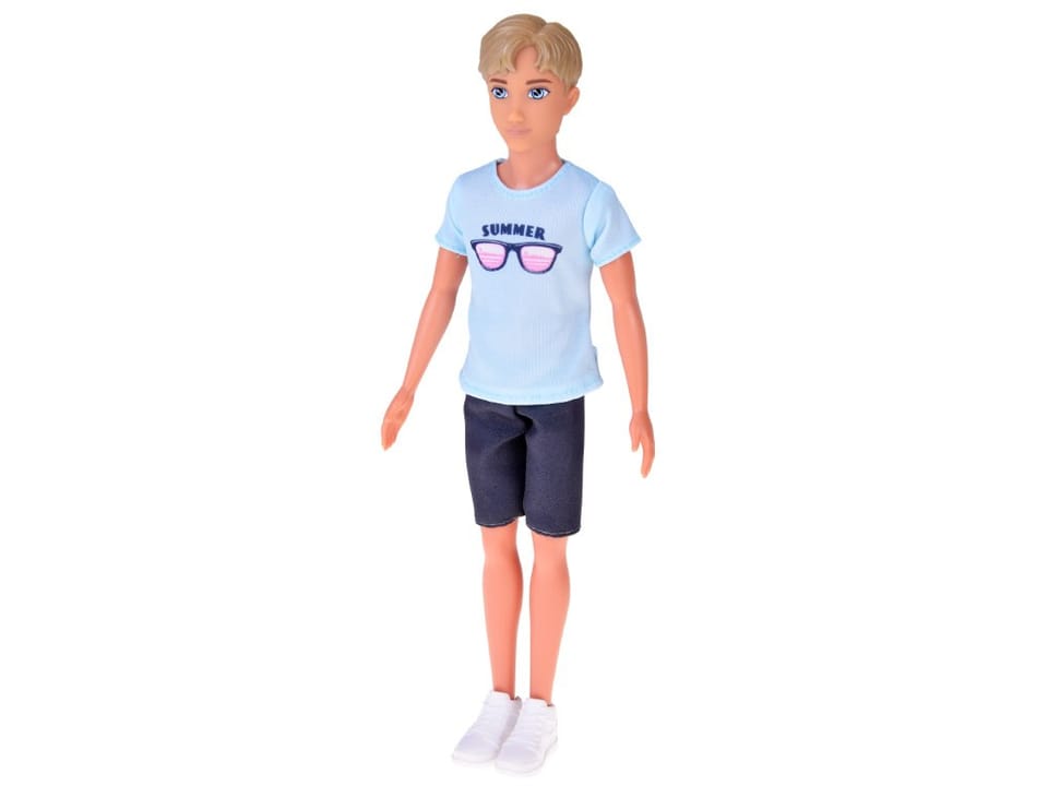 Lalka Tata to niebieskooki blondyn, ubrany w luźną, letnią stylizację- błękitny T-shirt, krótkie spodenki oraz białe, sportowe buty.