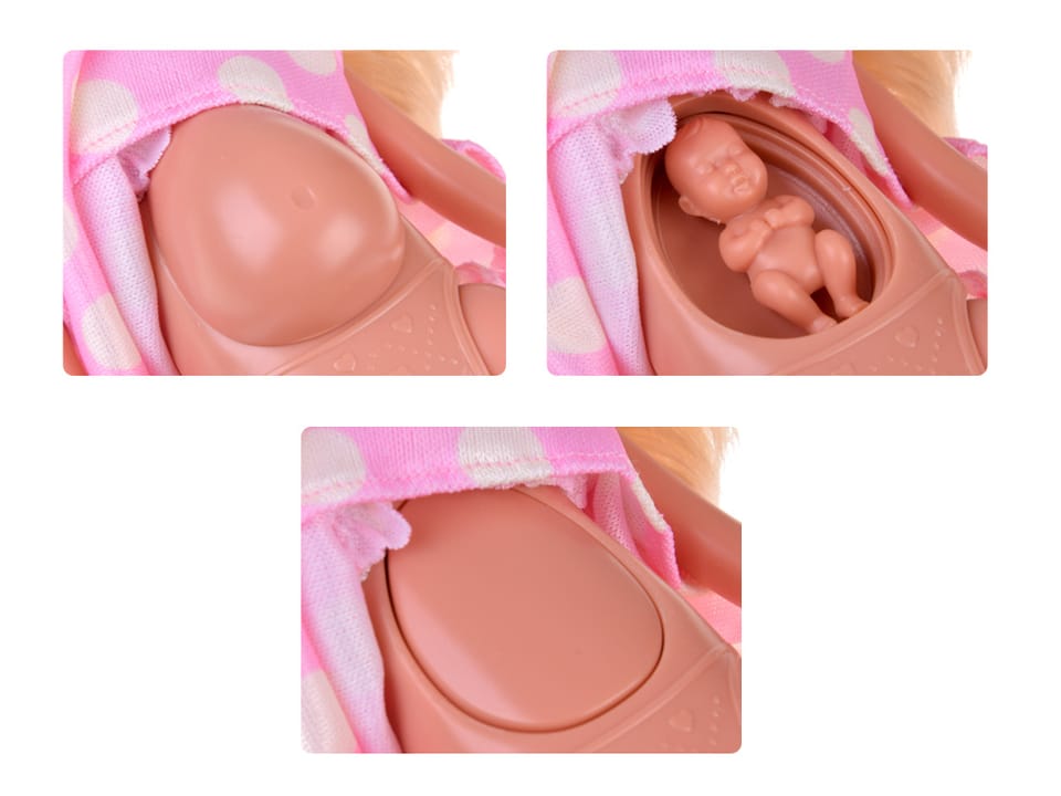 Lalka mama ma specjalnie otwierany brzuszek, z którego można wyjąć maleńkie dziecko - to doskonały sposób, by w zabawie pokazać, jak pojawia się nowy członek rodziny. Obie lalki posiadają ruchome kończyny.