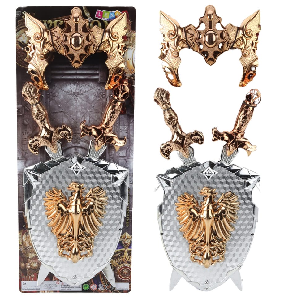 Zestaw rycerski dla dzieci to idealna propozycja dla małych fanów przygód, średniowiecznych legend i zabaw w dzielnych wojowników. W zestawie znajdują się dwa imponujące miecze, ozdobna tarcza z motywem złotego orła oraz maska.