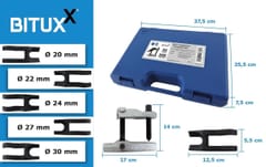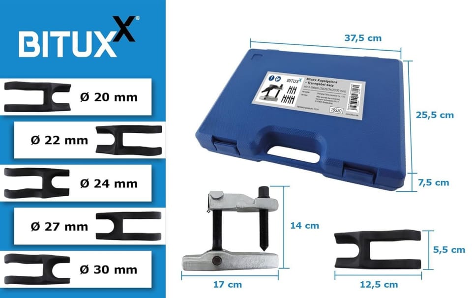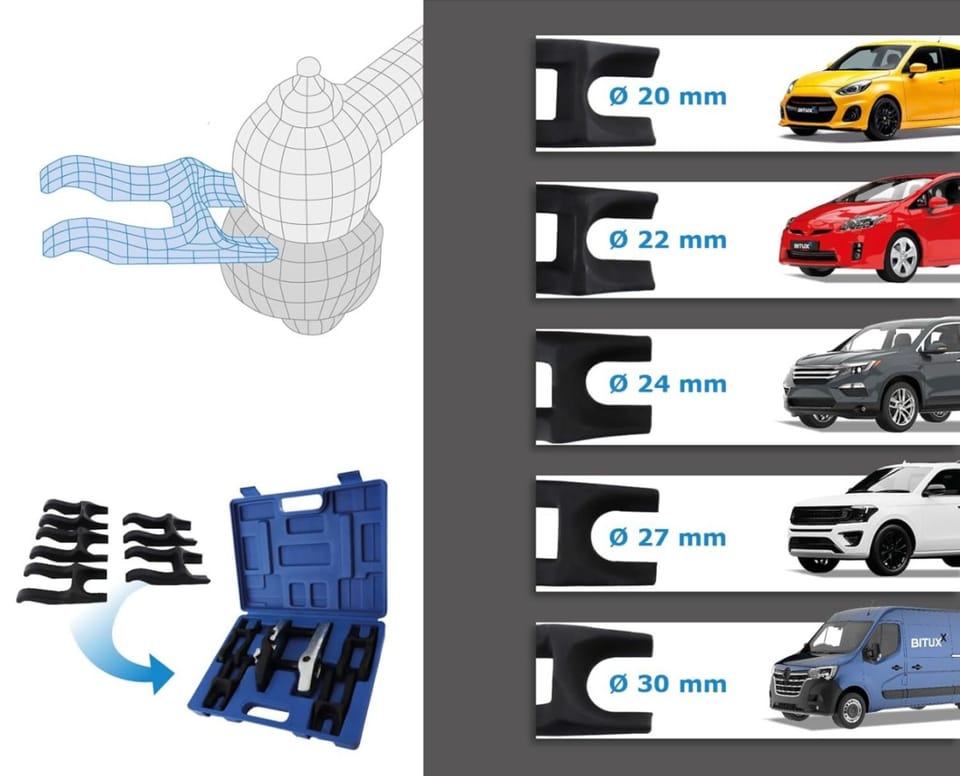 Profesjonalny zestaw ściągaczy kulowych marki Bituxx przeznaczony do demontażu przegubów kulowych, końcówek drążków kierowniczych oraz elementów zawieszenia. Uniwersalna konstrukcja umożliwia zastosowanie w większości modeli samochodów osobowych.