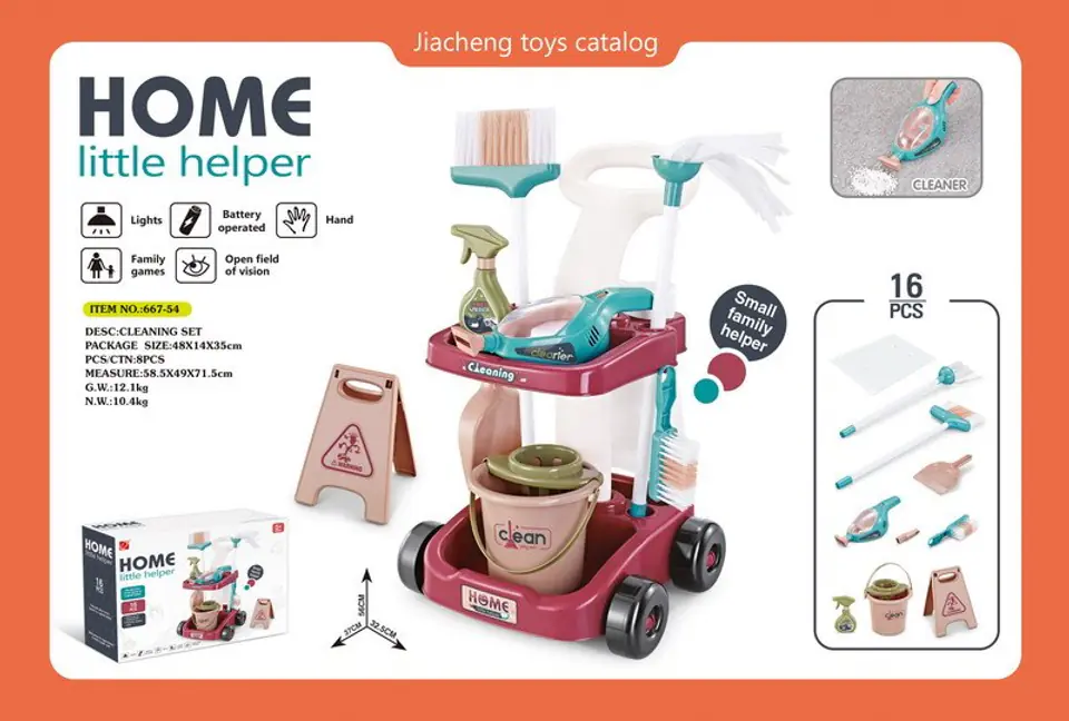 - wózek ok. 56 cm x 32,5 cm x 37 cm, - tablica ostrzegawcza ok. 19 cm x 13 cm, - mop ok. 50 cm - szczotka ok. 50 cm, - worek foliowy na śmieci ok. 31 cm x 20 cm, - szufelka ok. 19 cm x 12 cm, - odkurzacz ręczny ok. 23 cm x 9 cm x 8 cm, - atrapa spryskiwacza ok. 13 cm x 7 cm, - wiaderko ok. 15 cm x 13 cm, - miotła ok. 49 cm x 14 cm x 3 cm, - średnica koła ok. 8 cm, - opakowanie ok. 48 cm x 14 cm x 35 cm.