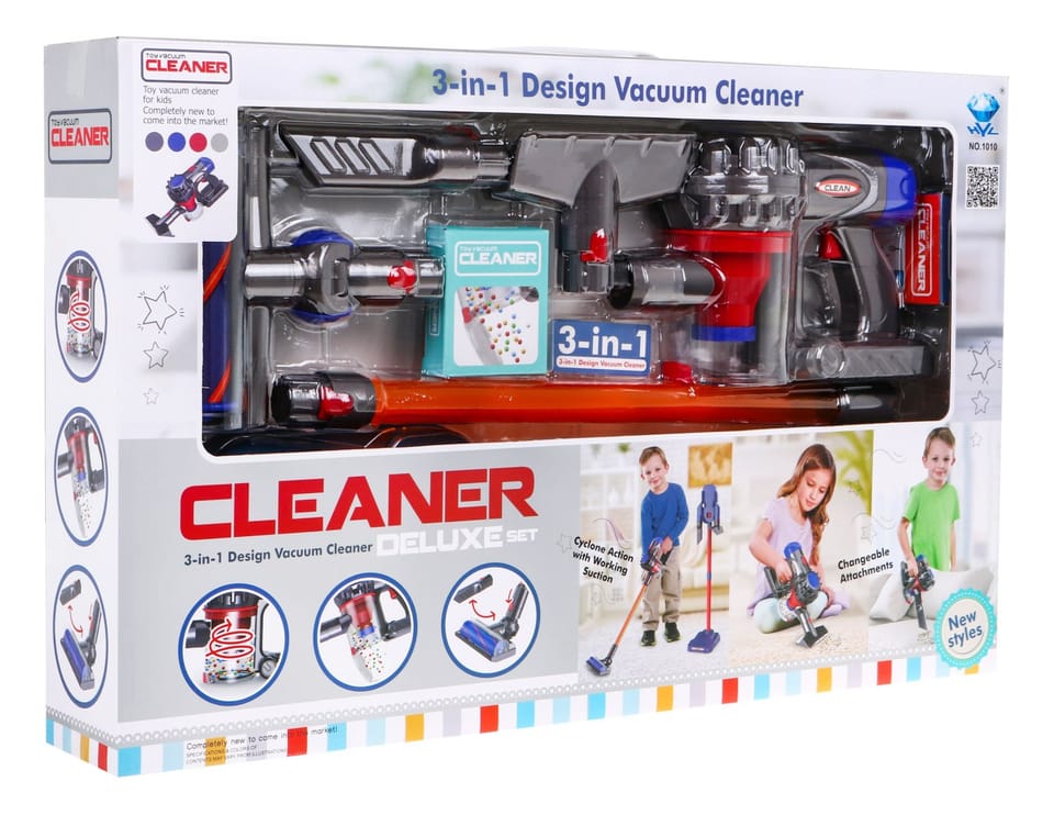 Odkurzacz 3w1 z efektami dźwiękowymi to zabawka dla dzieci powyżej trzeciego roku życia. Uczy dziecko utrzymywać porządek we własnym pokoju. Zabawka ta jest wyjątkowo udaną kopią prawdziwego odkurzacza pionowego. Łatwo i szybko możemy ją przekształcić w mały ręczny odkurzacz. Urządzenie wydaje odgłosy ssania oraz wciąga dołączone do zestawu kuleczki styropianowe, które dodatkowo po wciągnięciu do zbiornika wirują. Zabawka zasilana jest bateriami typu 3 x AA 1,5V (brak w zestawie).