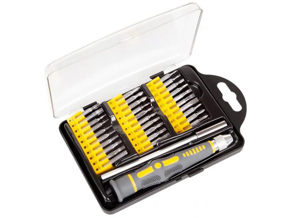 Zestaw śrubokręt precyzyjny Rebel Tools z 32 końcówkami to pewność, że w Twoim warsztacie nie zabraknie tego śrubokrętu, który w danej chwili jest Ci potrzebny. W zestawie znajdziesz różne rodzaje bitów w tym: płaskie, krzyżowe PH, krzyżowe PZ, Torx i Hex. Szybko zaciskowy uchwyt mocujący w połączeniu z magnetycznym uchwytem przedłużającym pozwalają na pewną oraz swobodną i komfortową pracę. Dzięki wykonaniu ze stali chromowo-wanadowej, odpornej na korozję i powstawanie rdzy, zestaw posłuży Ci naprawdę długo. Skorzystaj ze śrubokręta precyzyjnego Rebel Tools i rób bez ograniczeń to, co sprawia Ci przyjemność!