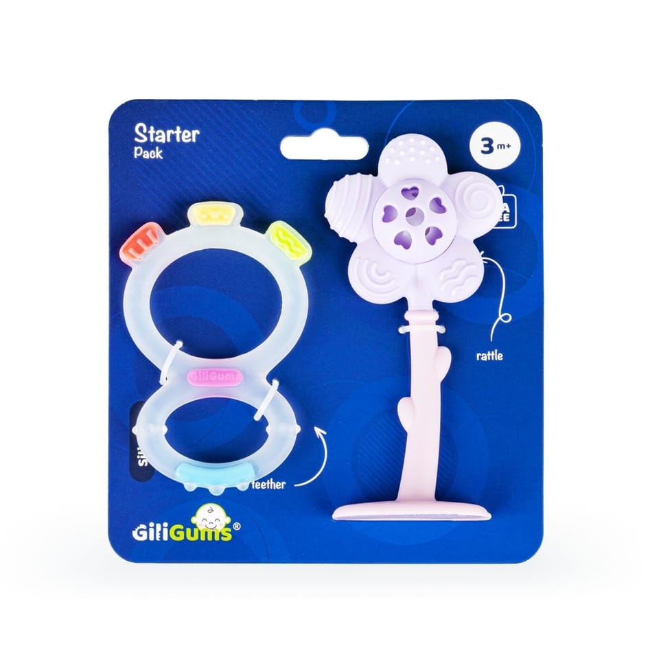 Pastelowo i uroczo witamy na świecie! Pierwszy zestaw dla maluszka składa się z dwóch praktycznych zabawek: gryzaka Ósemki oraz Radosnego Kwiatka w kolorze fioletowym. Zabawki posiadają wypustki, które podczas gryzienia będą delikatnie masować dziąsła bobasa, przynosząc mu tym samym ulgę w ząbkowaniu. Kształt gryzaka i grzechotki ułatwia małym rączkom chwytanie zabawek. Zestaw sprawdzi się świetnie w charakterze prezentu.