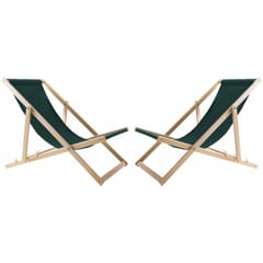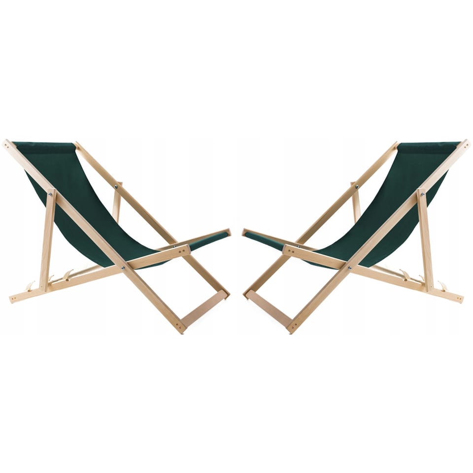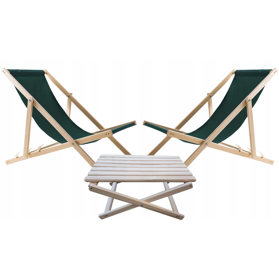 Cechy- Zestaw wykonany z wysokiej klasy drewna bukowego- Stabilny i trwały stelaż leżaków- Każdy element drewniany jest szlifowany i zaokrąglony- Wytrzymała tkanina wysokiej jakości, oddychająca i odporna na warunki atmosferyczne- Tkanina nie rozciąga się, jest miła w dotyku- Możliwość łatwego zdjęcia tkaniny w celu wyprania- Trójstopniowa regulacja oparcia- Wytrzymałość leżaków: 120 kg- Kolor tkaniny: zielony