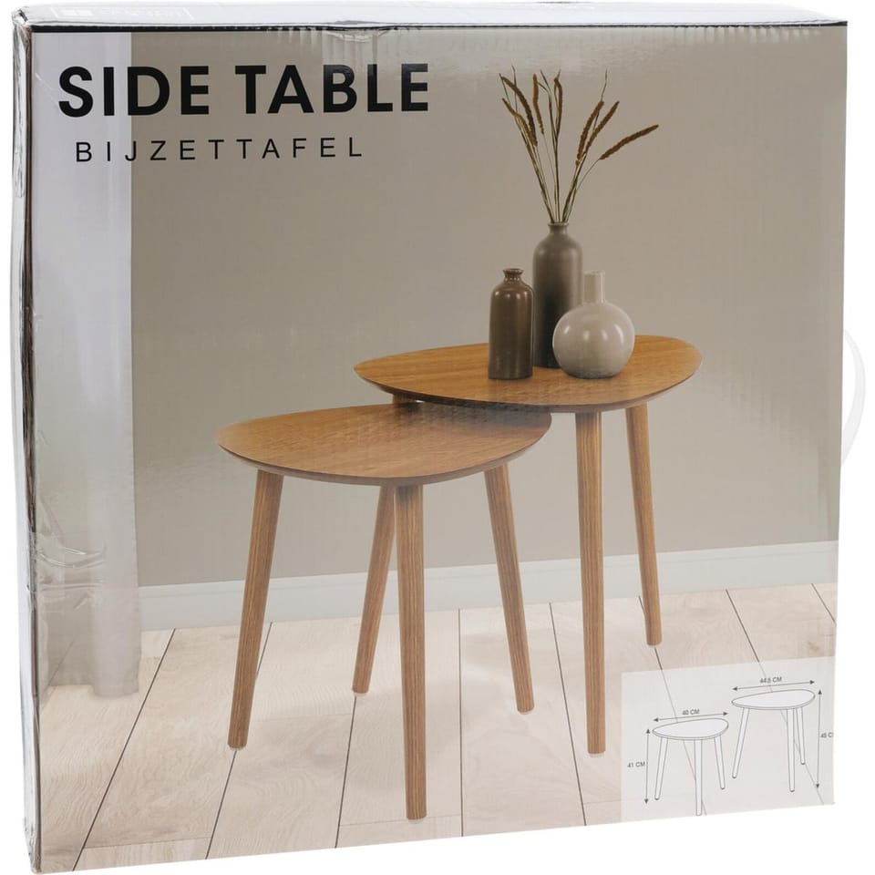 Parametry:- Wymiary stolików ok.: duży 45 x 44,5 cm/ mały 40 x 41 cmMateriał: blat MDF, nogi drewno sosnoweW zestawie: 2 stolikiKolor: brązowyWaga netto ok.: 3,83kgMarka: HOME & STYLING COLLECTIONIlość nóg w stoliku: 3
