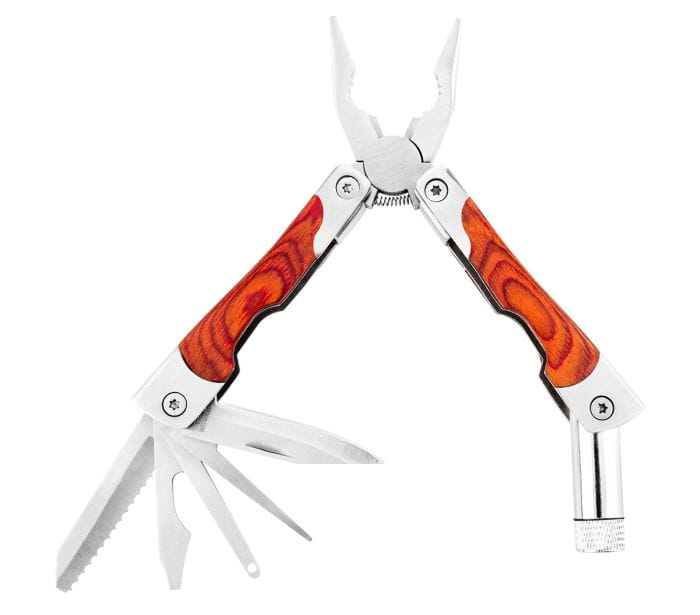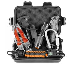 Zestaw survivalowy 8 w 1 w pudełku zawiera nóż z ostrzem składanym, latarka, multitool, piła drutowa, bransoletka przetrwania (lina paracord, krzesiwo, kompas), krzesiwo z otwieraczem do butelek, karabińczyk, pudełko plastikowe