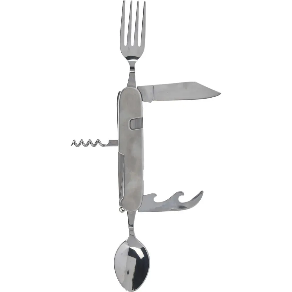 - wykonany ze stali nierdzewnejwyposażony w 6 różnych narzędzi, pokrowiec i kółko do zawieszeniaprzydatny na wyjazdach, wycieczkach, obozach, kempingach podczas wędkowania i survivalu niektóre elementy posiadają specjalne nacięcie, które ułatwia wysunięciewidelec i łyżka idealne do jedzenia w tereniez kółkiem do zawiedzenia np.: przy kluczachkompaktowy i łatwy w obsłudze