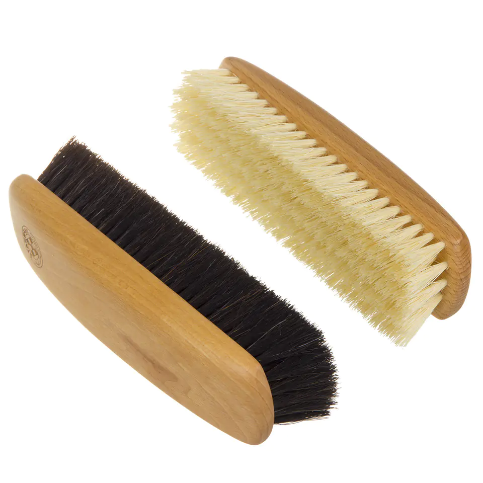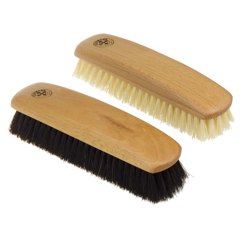 Najwyższej jakości szczotki zrobione są ze 100% naturalnych surowców.Drobiazgowo wypolerowane drewno bukowe, które dwukrotnie zanurzamy w gorącym oleju lnianym jest nabite, w przypadku szczotki do polerowania najlepszej jakości 100% włosiem końskim a w szczotce do czyszczenia, włóknem z agawy - 100% tampico.Szczotki doskonale leżą w dłoni, bardzo zadbaliśmy o ergonomię oprawy a najwyższej jakości naturalne surowce perfekcyjnie czynią swoją powinność, doprowadzając skórę buta do błysku.Szczotki są w 100% ekologiczne.
