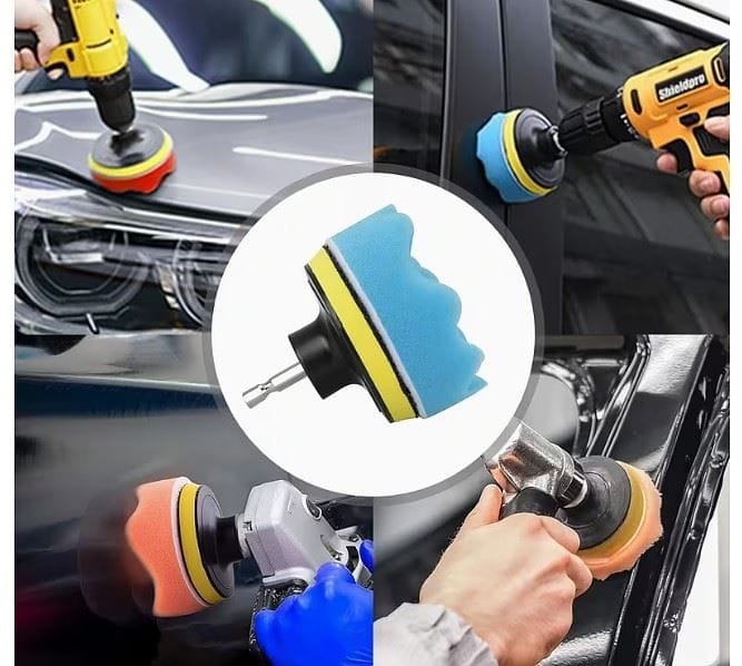 Zestaw szczotek i gąbek do polerowania zawiera: szczotki oraz gąbki obrotowe montowane do zwykłego gwintu z wkrętarki bądź wiertarki. Dobrze sprawują się przy auto detailing'u zewnętrznym: przy lampach, szybach czy nadwoziu.