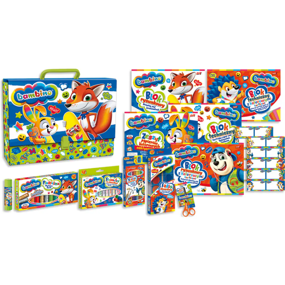 Zestaw zawiera najpotrzebniejsze materiały plastyczne spakowane w praktyczną teczkę z rączką o wymiarach 32 x 24,8 x 5 cm. Jest doskonałym pomysłem na: