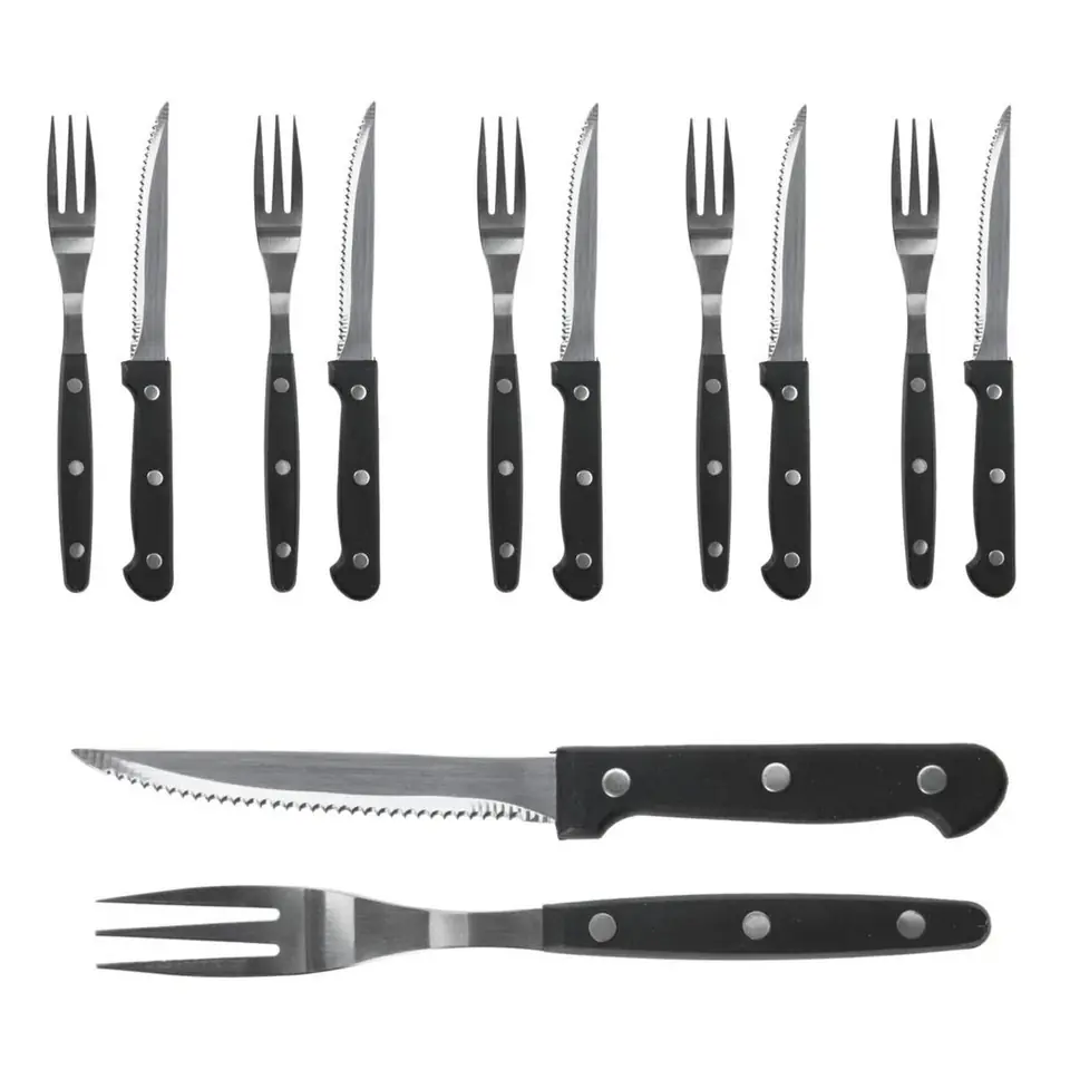 Warto zaopatrzyć się w odpowiednie narzędzia i akcesoria, które okażą się niezbędne w każdej kuchni. Ten zestaw sztućców składa się z 6 noży oraz 6 widelców. Tego rodzaju zestaw świetnie nadaje się do steków, grilla i pizzy. Okaże się bardzo przydatny nie tylko w sezonie letnim, ale także w ciągu całego roku. Sztućce wykonane są ze stali nierdzewnej, dodatkowym atutem jest solidna rączka z 3-punktowym nitowaniem ze stali. Takie materiały gwarantują trwałość oraz wygodę użytkowania. Ząbkowane ostrze noża poradzi sobie z każdym rodzajem mięsa. Polecane zarówno do użytku domowego jak i lokali gastronomicznych.W zestawie:- widelec (długość 19 cm, długość uchwytu 10 cm, szerokość 2 cm) - 6 szt- nóż (długość 21 cm, długość uchwytu 9,5 cm, szerokość 2 cm) - 6 szt