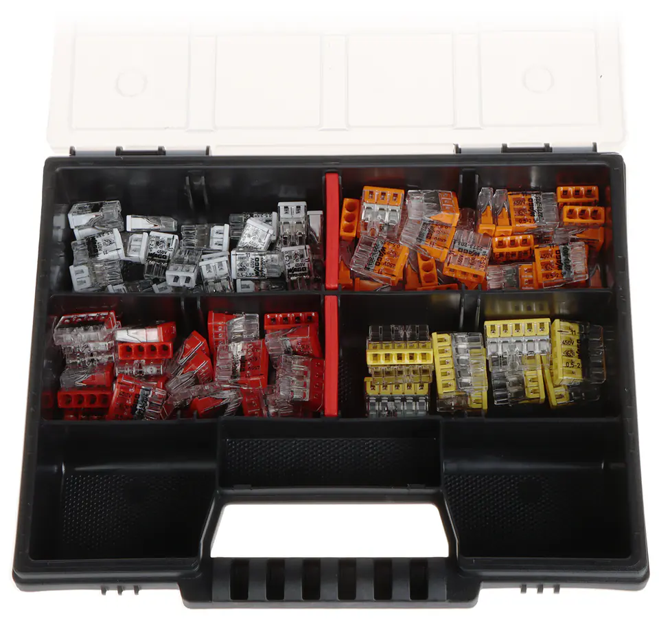 | Ilość szt. w opakowaniu: | 100 szt. (łącznie) Wciskane- 25 szt. - 2 x 0.5 - 2.5 mm² Drut- 40 szt. - 3 x 0.5 - 2.5 mm² Drut- 25 szt. - 4 x 0.5 - 2.5 mm² Drut- 10 szt. - 5 x 0.5 - 2.5 mm² Drut |