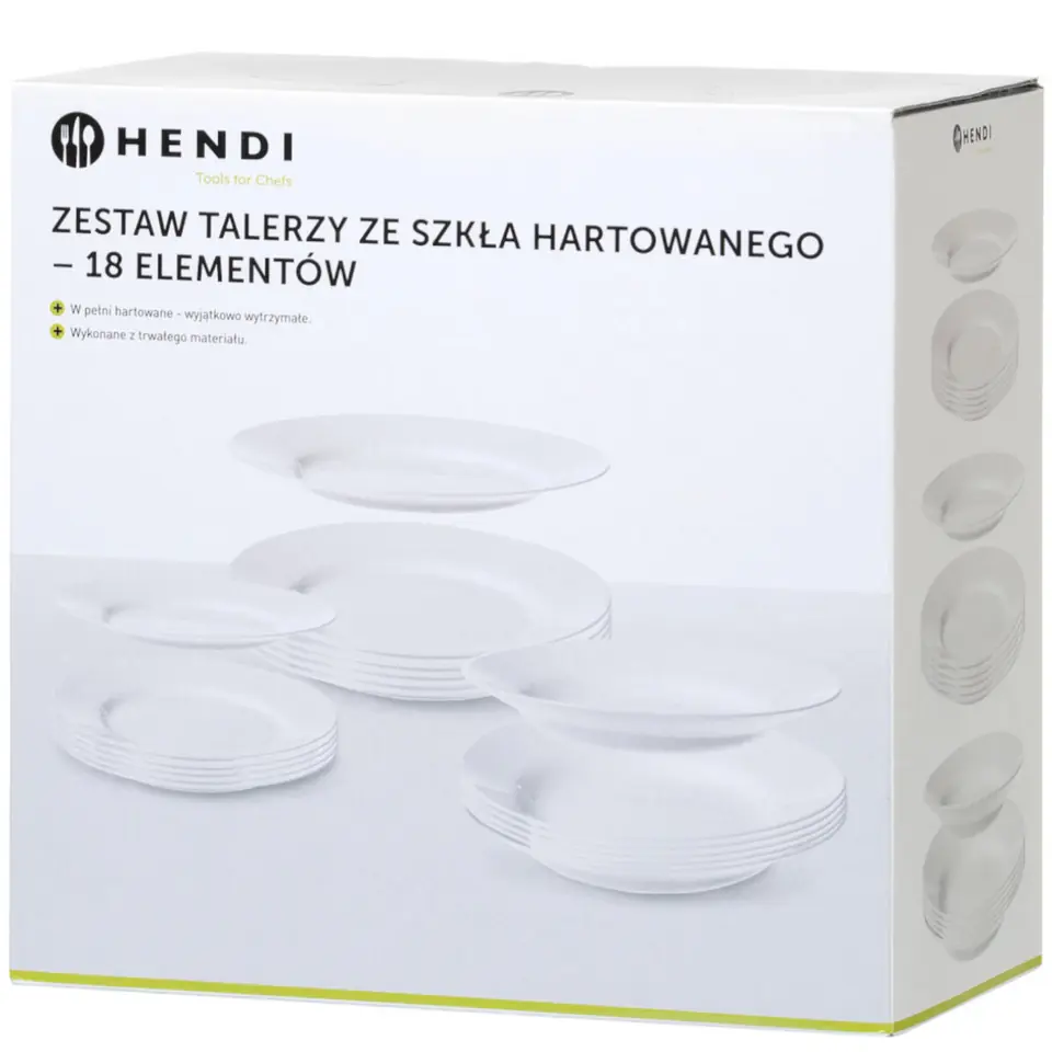 Zestaw talerzy firmy Hendi składa się z 18 elementów. Nadaje się do każdej restauracji, kuchni, czy jadalni. Wykonany został z trwałego materiału Opal, dzięki czemu posiada większą odporność na stłuczenia niż porcelana. Gładka powierzchnia gwarantuje ochronę przez rozwojem bakterii.