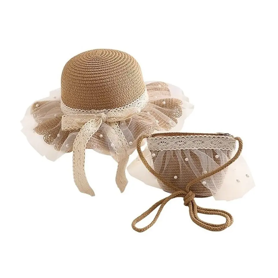 Zestal kapelusz dziecięcy słomkowy + torebka słomkowa TIUL PEREŁKIPiękny zestaw kapelusz wraz z pasującą torebką. Idealny do letnich stylizacji dla małej dziewczynki. Wiek: 2-6 latObwód kapelusza: 52 cmWymiary torebki: 14,5 cm x 12 cmWaga zestawu:150 g