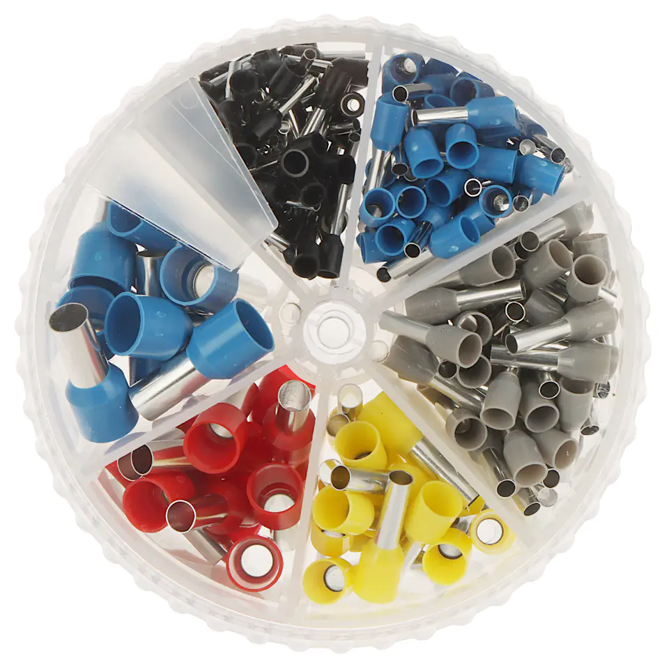Zestaw tulejek kablowych o przekrojach od 1.5 mm2 do 16 mm2 z organizeremTulejki kablowe przeznaczone są do zaciskania na przewodach wielodrutowych w celu utrzymania razem wszystkich luźnych drucików przewodu oraz zmniejszenia ryzyka wystąpienia zwarcia