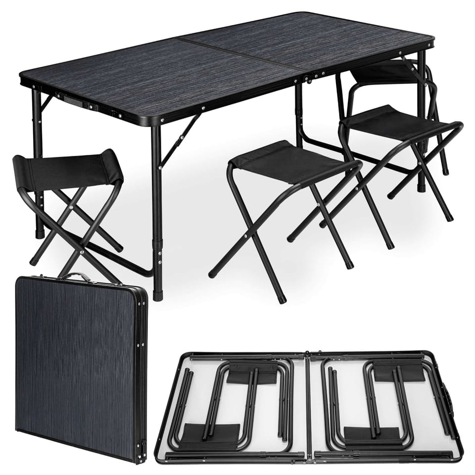Zestaw turystyczny TRAMP kempingowy składany 120x60 cm black wood czarnyWymiary: 120 x 60 cm | Kolory: black wood | Model: TRAMP⭐Kolor blatu: black wood⭐Kolor stelaża: czarny⭐W zestawie: stolik i x4 krzesełka⭐Aż 3 poziomy regulacji wysokości!⭐Zakup od producenta Turystyczny zestaw kempingowy TRAMP składa się ze stołu i czterech krzeseł. Komplet wygodnie się rozkłada i składa do postaci walizki. W transporcie pomaga wygodna rączka. Stolik posiada regulowaną wysokość, blat można ustawić na trzech wysokościach. Stelaż TRAMP wykonano z wysokiej jakości aluminium, dzięki czemu jest bardzo lekki. Blat powstał z trwałej płyty MDF. Takie połączenie materiałów zapewnia niską wagę, dzięki czemu transportowanie zestawu jest bezproblemowe. Rozkładanie stolika i krzesełek jest bardzo proste. Stolik wyposażony został w rączkę, która umożliwia wygodne przenoszenie. Cechy produktu:materiał blatu: płyta MDFkolor blatu: black woodmateriał stelaża stołu: aluminiummateriał stelaża krzeseł: stalmateriał siedzisk krzeseł: poliesterwaga zestawu z opakowaniem: 7 kgwaga stołu: 4 kgwaga krzesła: 0,6 kgMaksymalne obciążenie: 20 kg Zalety:✅Kompaktowy design✅Przenośny ✅Lekki✅Regulowana wysokość: Stół oferuje możliwość trzystopniowej regulacji wysokości, co pozwala dostosować go do różnych potrzeb i ustawień.✅Prostota rozkładania✅Wysoka jakość materiałów✅Niska waga Wymiary stołu:Szerokość: 60 cmWysokość: 55 - 69 cm*Długość: 120 cmRozstaw nóg: 110 x 55 cm* wysokość regulowana trzypoziomowa Wymiary po złożeniu:60 x 60 x 6,5 cmStół posiada aż trzy poziomy regulacji wysokości:1 poziom - 55 cm2 poziom - 61,5 cm3 poziom - 69 cm Informacje dodatkowePrzedstawione kolory należy traktować poglądowo - mogą odbiegać od rzeczywistych ze względu na różne ustawienia monitorów oraz proces obróbki zdjęć. Rzeczywiste wymiary mogą się różnić od podanych wyżej. Tolerancja błędów może wynosić +/- 5%. Marka:OutdoriumKod produktu:066685MGKod EAN:5905523066685Kolor:black woodDługość: 120 cmSzerokość:60 cmWysokość:55 - 69 cmDo samodzielnego montażu:nie wymaga