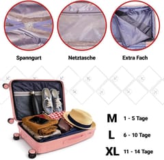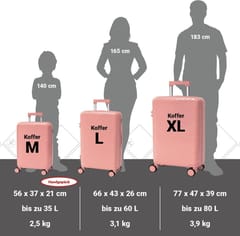 Zestaw obejmuje trzy pojemne walizki w różnych rozmiarach – XL, L oraz M, dzięki czemu można je dopasować do długości podróży.