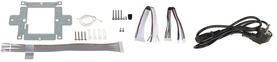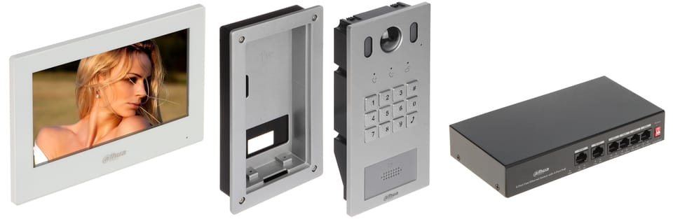 W skład zestawu wchodzą: panel wewnętrzny VTH2621GW-WP, wideodomofon VTO3222E-P, switch PoE PFS3006-4ET-36 oraz obudowa podtynkowa VTM116-01