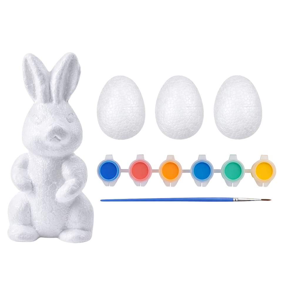 Zestaw zawiera 3 styropianowe jajka oraz figurkę zająca. Dodatkowo dołączone są farbki w 6 kolorach.