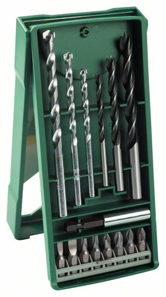 Spis treści: 3 wiertła do muru, O 5/6/8 mm 3 wiertła do drewna, O 4/6/8 mm 8 końcówek wkręcających, L = 25 mm PH 1/2 PZ 1/2 S 4/6 T 20/25 1 uchwyt uniwersalny, magnetyczny