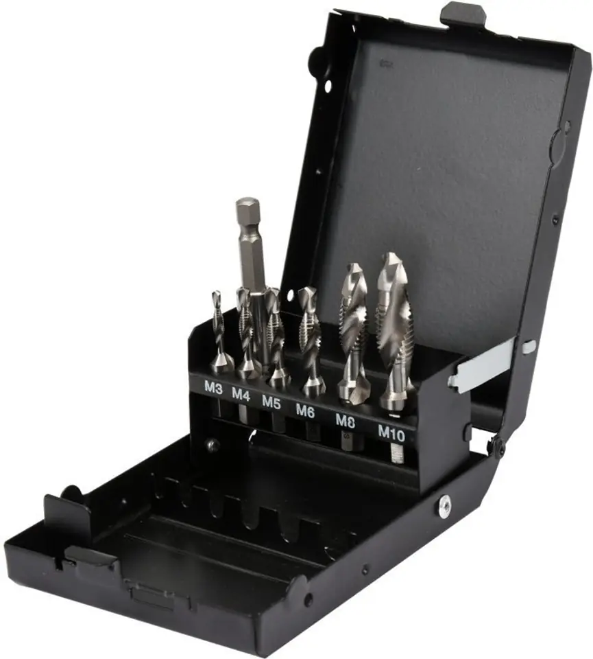 Zestaw zawiera 6 wierteł o rozmiarach M3-M10 (3, 4, 5, 6, 8,10) oraz przedłużkę 60