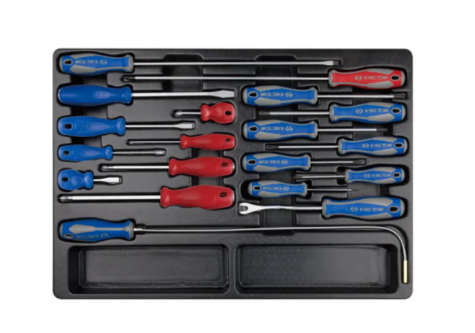 Zestaw 19 wkrętaków King Tony. W zestawie znajdują się różne rodzaje śrubokrętów: krzyżakowe z plastikową rączką No.0 x 75, No.2 x 38, krzyżakowe ślusarskie z plastikową rączką No.2 x 100 i No.3 x 150, płaskie z plastikową rączką 3 x 75 i 6.5 x 38 oraz płaskie ślusarskie z plastikową rączką 6.5 x 100 i 8 x 150. Oprócz tych wkrętaków w zestawie znajdują się jeszcze dwa długie śrubokręty (300 mm ) o końcówce płaskiej 6.5 oraz krzyżakowej No.2. W skład kompletu wchodzi także mały zestaw śrubokrętów z końcówką Tor x w rozmiarach T8 x 75, T10 x 75, T15 x 75, T20 x 100, T25 x 100, T27 x 100, T30 x 125 oraz przyrząd do demontażu tapicerki z uchwytem wkrętakowym i uchwyt wyginany z końcówką magnetyczną. Cały zestaw znajduje się w wytłoczce pasującej do wózków warsztatowych King Tony. Karta produktu - 9-31919MR