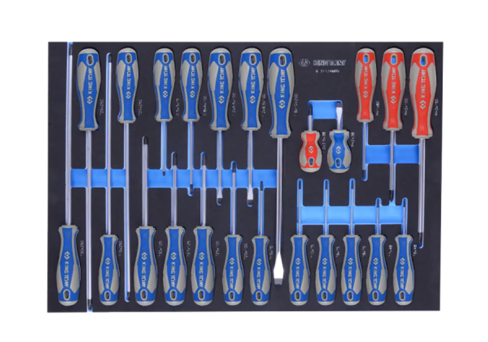 ZESTAW WKRĘTAKÓW 24 cz. KRZYŻAKI PH1 - PH3, PŁASKIE 3 - 10mm, TORX T6 - T30, WKŁAD Z PIANKI EVA DO WÓZKA King Tony